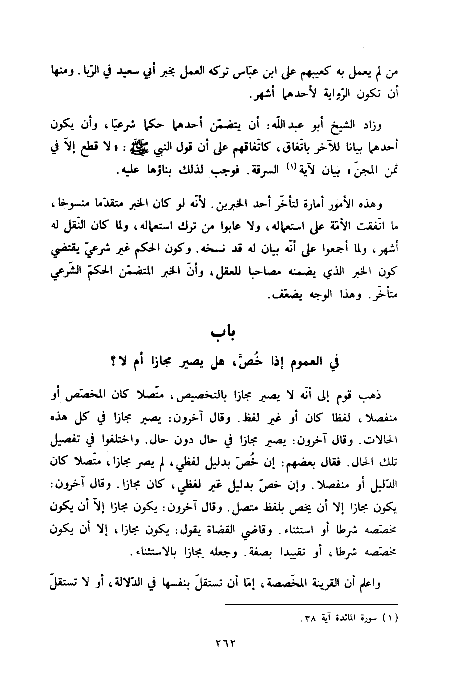 وَهَذِه الْأُمُور أَمارَة لتأخر أحد الْخَبَرَيْنِ لِأَنَّهُ لَو كَانَ الْخَبَر مُتَقَدما مَنْسُوخا مَا اتّفقت الْأمة على اسْتِعْمَاله وَلَا عابوا من ترك اسْتِعْمَاله وَلما كَانَ النَّقْل لَهُ أشهر وَلما أَجمعُوا على أَنه بَيَان لَهُ قد نسخه وَكَون الحكم غير شَرْعِي يَقْتَضِي كَون الْخَبَر الَّذِي يضمنهُ مصاحبا لِلْعَقْلِ وَأَن الْخَبَر المتضمن الحكم الشَّرْعِيّ مُتَأَخّر وَهَذَا الْوَجْه يضعف - صَلَّى اللَّهُ عَلَيْهِ وَسَلَّم َ - بَاب فِي الْعُمُوم إِذا خص هَل يصير مجَازًا أم لَا - صَلَّى اللَّهُ عَلَيْهِ وَسَلَّم َ -