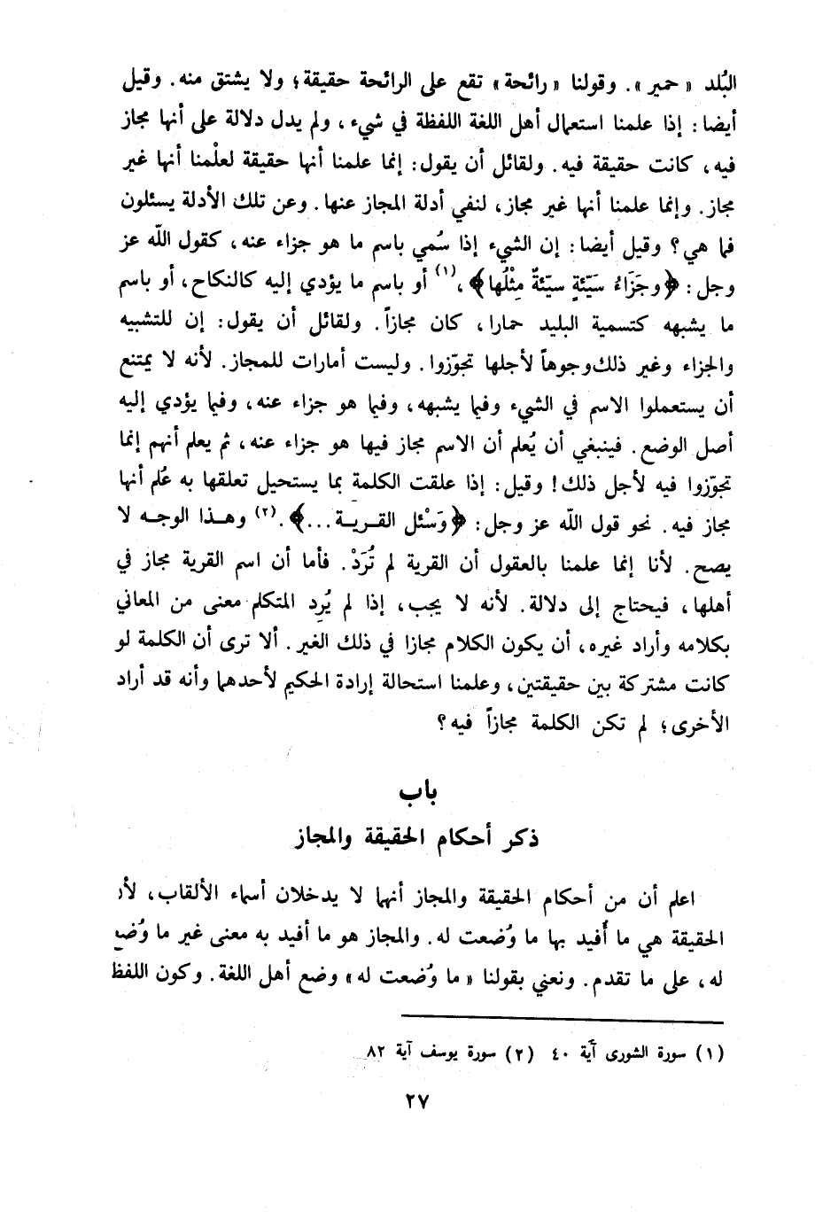 الْبَلَد حمير وَقَوْلنَا رَائِحَة تقع على الرَّائِحَة حَقِيقَة وَلَا يشتق مِنْهُ وَقيل أَيْضا إِذا علمنَا اسْتِعْمَال أهل اللُّغَة اللَّفْظَة فِي شَيْء وَلم يدل دلَالَة على أَنَّهَا مجَاز فِيهِ كَانَت حَقِيقَة فِيهِ وَلقَائِل أَن يَقُول إِنَّمَا علمنَا أَنَّهَا حَقِيقَة لعلمنا أَنَّهَا غير مجَاز وَإِنَّمَا علمنَا أَنَّهَا غير مجَاز لنفي ادلة الْمجَاز عَنْهَا وَعَن تِلْكَ الْأَدِلَّة يسئلون فَمَا هِيَ وَقيل أَيْضا إِن الشَّيْء إِذا سمي باسم مَا هُوَ جَزَاء عَنهُ كَقَوْل الله عز وَجل {وَجَزَاء سَيِّئَة سَيِّئَة مثلهَا} أَو باسم مَا يُؤَدِّي إِلَيْهِ كَالنِّكَاحِ أَو باسم مَا يُشبههُ كتسمية البليد حمارا كَانَ مجَازًا وَلقَائِل أَن يَقُول إِن للتشبيه وَالْجَزَاء وَغير ذَلِك وُجُوهًا لأَجلهَا تجوزوا وَلَيْسَت أَمَارَات للمجاز لِأَنَّهُ لَا يمْتَنع أَن يستعملوا الِاسْم فِي الشَّيْء وَفِيمَا يُشبههُ وَفِيمَا هُوَ جَزَاء عَنهُ وَفِيمَا يُؤَدِّي إِلَيْهِ أصل الْوَضع فَيَنْبَغِي أَن يعلم أَن الِاسْم مجَاز فِيهَا هُوَ جَزَاء عَنهُ ثمَّ يعلم أَنهم إِنَّمَا تجوزوا فِيهِ لأجل ذَلِك وَقيل إِذا علقت الْكَلِمَة بِمَا يَسْتَحِيل تعلقهَا بِهِ علم أَنَّهَا مجَاز فِيهِ نَحْو قَول الله عز وَجل {واسأل الْقرْيَة} وَهَذَا الْوَجْه لَا يَصح لأَنا إِنَّمَا علمنَا بالعقول أَن الْقرْيَة لم ترد فَأَما أَن اسْم الْقرْيَة مجَاز فِي أَهلهَا فَيحْتَاج إِلَى دلَالَة لِأَنَّهُ لَا يجب إِذا لم يرد الْمُتَكَلّم معنى من الْمعَانِي بِكَلَامِهِ وَأَرَادَ غَيره أَن يكون الْكَلَام مجَازًا فِي ذَلِك الْغَيْر أَلا ترى أَن الْكَلِمَة لَو كَانَت مُشْتَركَة بَين حقيقتين وَعلمنَا اسْتِحَالَة إِرَادَة الْحَكِيم لأَحَدهمَا وَأَنه قد أَرَادَ الْأُخْرَى لم تكن الْكَلِمَة مجَازًا فِيهِ - صَلَّى اللَّهُ عَلَيْهِ وَسَلَّم َ - بَاب ذكر أَحْكَام الْحَقِيقَة وَالْمجَاز - صَلَّى اللَّهُ عَلَيْهِ وَسَلَّم َ -