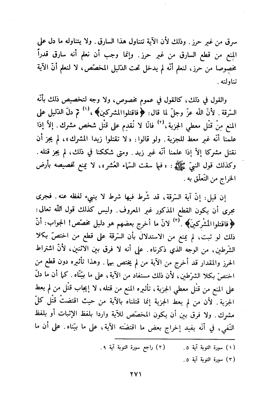 وَالْقَوْل فِي ذَلِك كالقول فِي عُمُوم مَخْصُوص وَلَا وَجه لتخصيص ذَلِك بِأَنَّهُ السّرقَة لِأَن الله عز وَجل لما قَالَ {فَاقْتُلُوا الْمُشْركين} ثمَّ دلّ الدَّلِيل على الْمَنْع من قتل معطي الْجِزْيَة فانا لَا نقدم على قتل شخص مُشْرك إِلَّا إِذا علمنَا أَنه غير معط للجزية وَلَو قَالُوا لَا تقتلُوا زيدا الْمُشرك لم يجز أَن نقْتل مُشْركًا إِلَّا إِذا علمنَا أَنه غير زيد وَمَتى شككنا فِي ذَلِك لم يجز قَتله وَكَذَلِكَ قَول النَّبِي صلى الله عَلَيْهِ وَسلم فِيمَا سقت السَّمَاء الْعشْر لَا يمْنَع تَخْصِيصه بِأَرْض الْخراج من التَّعَلُّق بِهِ