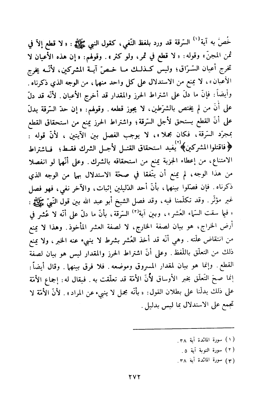 خص بِهِ آيَة السّرقَة قد ورد بِلَفْظ النَّفْي كَقَوْل النَّبِي صلى الله عَلَيْهِ وَسلم لَا قطع إِلَّا فِي ثمن الْمِجَن وَقَوله لَا قطع فِي ثَمَر وَلَو كثر وَقَوْلهمْ إِن هَذِه الْأَعْيَان لَا تخرج أَعْيَان السراق وَلَيْسَ كَذَلِك مَا خص آيَة الْمُشْركين لِأَنَّهُ يخرج الْأَعْيَان لَا يمْنَع من الِاسْتِدْلَال على كل وَاحِد مِنْهُمَا من الْوَجْه الَّذِي ذَكرْنَاهُ وَأَيْضًا فَإِن مَا دلّ على اشْتِرَاط الْحِرْز والمقدار قد أخرج الْأَعْيَان لِأَنَّهُ قد دلّ على أَن من لم يخْتَص بالشرطين لَا يجوز قطعه وَقَوْلهمْ إِن حد السّرقَة يدل على أَن الْقطع يسْتَحق لأجل السّرقَة وشتراط الْحِرْز يمْنَع من اسْتِحْقَاق الْقطع بِمُجَرَّد السّرقَة فَكَانَ مُجملا لَا يُوجب الْفَصْل بَين الْآيَتَيْنِ لِأَن قَوْله {فَاقْتُلُوا الْمُشْركين} بفيد اسْتِحْقَاق الْقَتْل لأجل الشّرك فَقَط فاشتراط الِامْتِنَاع من إِعْطَاء الْجِزْيَة يمْنَع من اسْتِحْقَاقه بالشرك وعَلى أَنَّهُمَا لَو انفصلا من هَذَا الْوَجْه لم يمْنَع أَن يتَّفقَا فِي صِحَة الِاسْتِدْلَال بهما من الْوَجْه الَّذِي ذَكرْنَاهُ فَإِن فصلوا بَينهمَا بِأَن أحد الدَّلِيلَيْنِ إِثْبَات وَالْآخر نفي فَهُوَ فصل غير مُؤثر وَقد تكلمنا فِيهِ وَقد فصل الشَّيْخ أَبُو عبد الله بَين قَول النَّبِي صلى الله عَلَيْهِ وَسلم فِيمَا سقت السَّمَاء الْعشْر وَبَين آيَة السّرقَة بِأَن مَا دلّ على أَنه لَا عشر فِي أَرض الْخراج هُوَ بَيَان لصفة الْخَارِج لَا لصفة الْعشْر الْمَأْخُوذ وَهَذَا لَا يمْنَع من انْتِقَاض علته وَهِي أَنه قد أَخذ الْعشْر بِشَرْط لَا ينبيء عَنهُ الْخَبَر وَلَا يمْنَع ذَلِك من التَّعَلُّق بِاللَّفْظِ وعَلى أَن اشْتِرَاط الْحِرْز والمقدار لَيْسَ هُوَ بَيَان لصفة الْقطع وَإِنَّمَا هُوَ بَيَان لمقدار الْمَسْرُوق وموضعه فَلَا فرق بَينهمَا وَقَالَ أَيْضا إِنَّمَا صَحَّ التَّعَلُّق بِخَبَر الأوساق لِأَن الْأمة قد تعلّقت بِهِ فَيُقَال لَهُ إِجْمَاع الْأمة على ذَلِك يدلنا على بطلَان القَوْل بِأَنَّهُ مُجمل لَا ينبيء عَن المُرَاد لِأَن الْأمة لَا تجمع على الِاسْتِدْلَال بِمَا لَيْسَ بِدَلِيل
