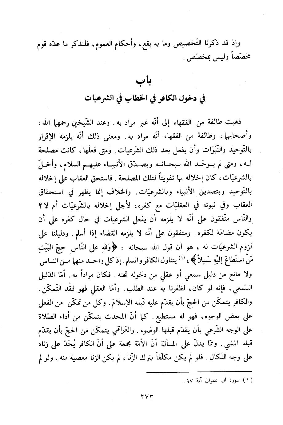 ذهبت طَائِفَة من الْفُقَهَاء إِلَى أَنه غير مُرَاد بِهِ وَعند الشَّيْخَيْنِ رحمهمَا الله وأصحابهما وَطَائِفَة من الْفُقَهَاء أَنه مُرَاد بِهِ وَمعنى ذَلِك أَنه يلْزمه الْإِقْرَار بِالتَّوْحِيدِ والنبوات وَأَن يفعل بعد ذَلِك الشرعيات وَمَتى فعلهَا كَانَت مصلحَة لَهُ وَمَتى لم يوحد الله سُبْحَانَهُ وَيصدق الْأَنْبِيَاء عَلَيْهِم السَّلَام وأخل بالشرعيات كَانَ إخلاله بهَا تفويتا لتِلْك الْمصلحَة فَاسْتحقَّ الْعقَاب على إخلاله بِالتَّوْحِيدِ وبتصديق الْأَنْبِيَاء وبالشرعيات وَالْخلاف إِنَّمَا يظْهر فِي اسْتِحْقَاق الْعقَاب وَفِي ثُبُوته فِي العقليات مَعَ كفره لأجل إخلاله بالشرعيات أم لَا وَالنَّاس متفقون على أَنه لَا يلْزمه أَن يفعل الشرعيات فِي حَال كفره على أَن يكون مضامة لكفره ومتفقون على أَنه لَا يلْزمه الْقَضَاء إِذا أسلم وَدَلِيلنَا على لُزُوم الشرعيات لَهُ هُوَ أَن قَول الله سُبْحَانَهُ {وَللَّه على النَّاس حج الْبَيْت من اسْتَطَاعَ إِلَيْهِ سَبِيلا} يتَنَاوَل الْكَافِر وَالْمُسلم إِذْ كل وَاحِد مِنْهُمَا من النَّاس وَلَا مَانع من دَلِيل سَمْعِي أَو عَقْلِي من دُخُوله تَحْتَهُ فَكَانَ مرَادا بِهِ أما الدَّلِيل السمعي فَإِنَّهُ لَو كَانَ لظفرنا بِهِ عِنْد الطّلب وَأما الْعقلِيّ فَهُوَ فقد التَّمَكُّن وَالْكَافِر يتَمَكَّن من الْحَج بِأَن يقدم عَلَيْهِ قبله الْإِسْلَام وَكَانَ من تمكن من الْفِعْل على بعض الْوُجُوه فَهُوَ لَهُ مستطيع كَمَا أَن الْمُحدث يتَمَكَّن من أَدَاء الصَّلَاة على الْوَجْه الشَّرْعِيّ بِأَن يقدم قبلهَا الْوضُوء والعراقي يتَمَكَّن من الْحَج بِأَن يقدم قبله الْمَشْي وَمِمَّا يدل على الْمَسْأَلَة أَن الْأمة مجمعة على أَن الْكَافِر يحد على زِنَاهُ على وَجه النكال فَلَو لم يكن مُكَلّفا بترك الزِّنَا لم يكن الزِّنَا مَعْصِيّة مِنْهُ وَلَو لم