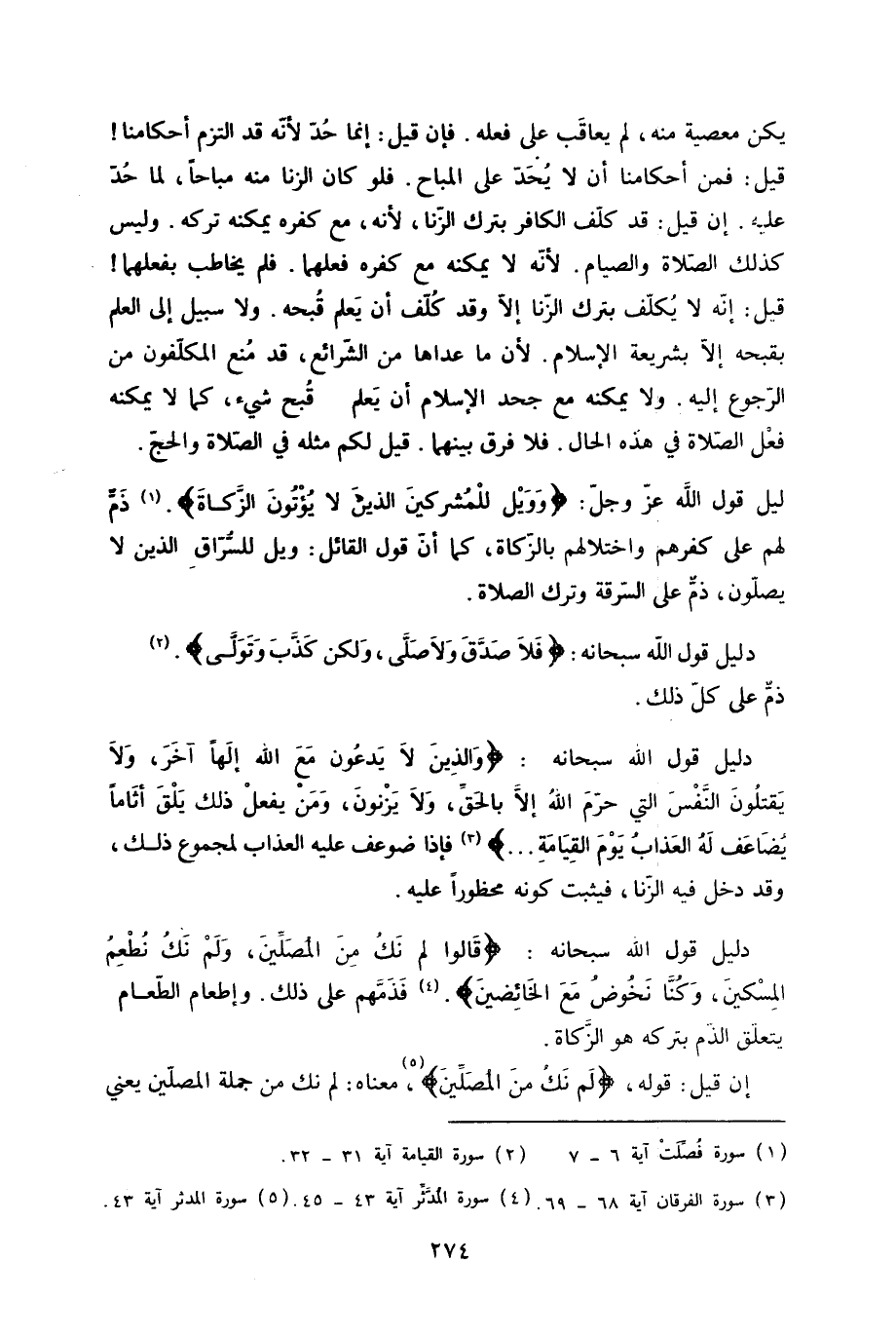 دَلِيل قَول الله عز وَجل {وويل للْمُشْرِكين الَّذين لَا يُؤْتونَ الزَّكَاة} ذمّ لَهُم على كفرهم واختلالهم بِالزَّكَاةِ كَمَا أَن قَول الْقَائِل ويل للسراق الَّذين لَا يصلونَ ذمّ على السّرقَة وَترك الصَّلَاة