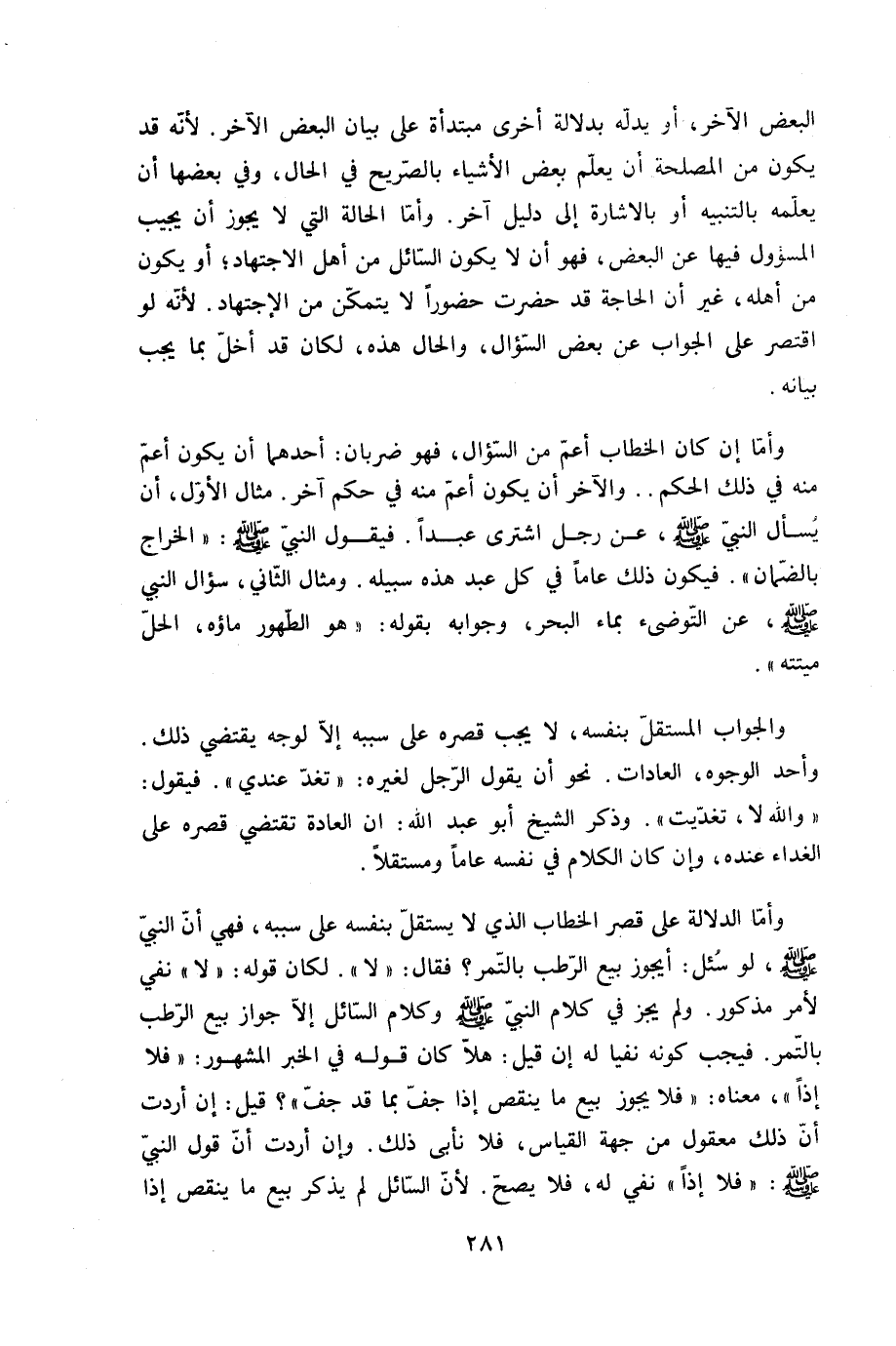 وَأما الدّلَالَة على قصر الْخطاب الَّذِي لَا يسْتَقلّ بِنَفسِهِ على سَببه فَهِيَ أَن النَّبِي صلى الله عَلَيْهِ وَسلم لَو سُئِلَ أَيجوزُ بيع الرطب بِالتَّمْرِ فَقَالَ لَا لَكَانَ قَوْله لَا نفي لأمر مَذْكُور وَلم يجز فِي كَلَام النَّبِي صلى الله عَلَيْهِ وَسلم وَكَلَام السَّائِل إِلَّا جَوَاز بيع الرطب بِالتَّمْرِ فَيجب كَونه نفيا لَهُ إِن قيل هلا كَانَ قَوْله فِي الْخَبَر الْمَشْهُور فَلَا إِذا مَعْنَاهُ فَلَا يجوز بيع مَا ينقص إِذا جف بِمَا قد جف قيل إِن أردْت أَن ذَلِك مَعْقُول من جِهَة الْقيَاس فَلَا نأبى ذَلِك وَإِن أردْت أَن قَول النَّبِي صلى الله عَلَيْهِ وَسلم فَلَا إِذا نفي لَهُ فَلَا يَصح لِأَن السَّائِل لم يذكر بيع مَا ينقص إِذا