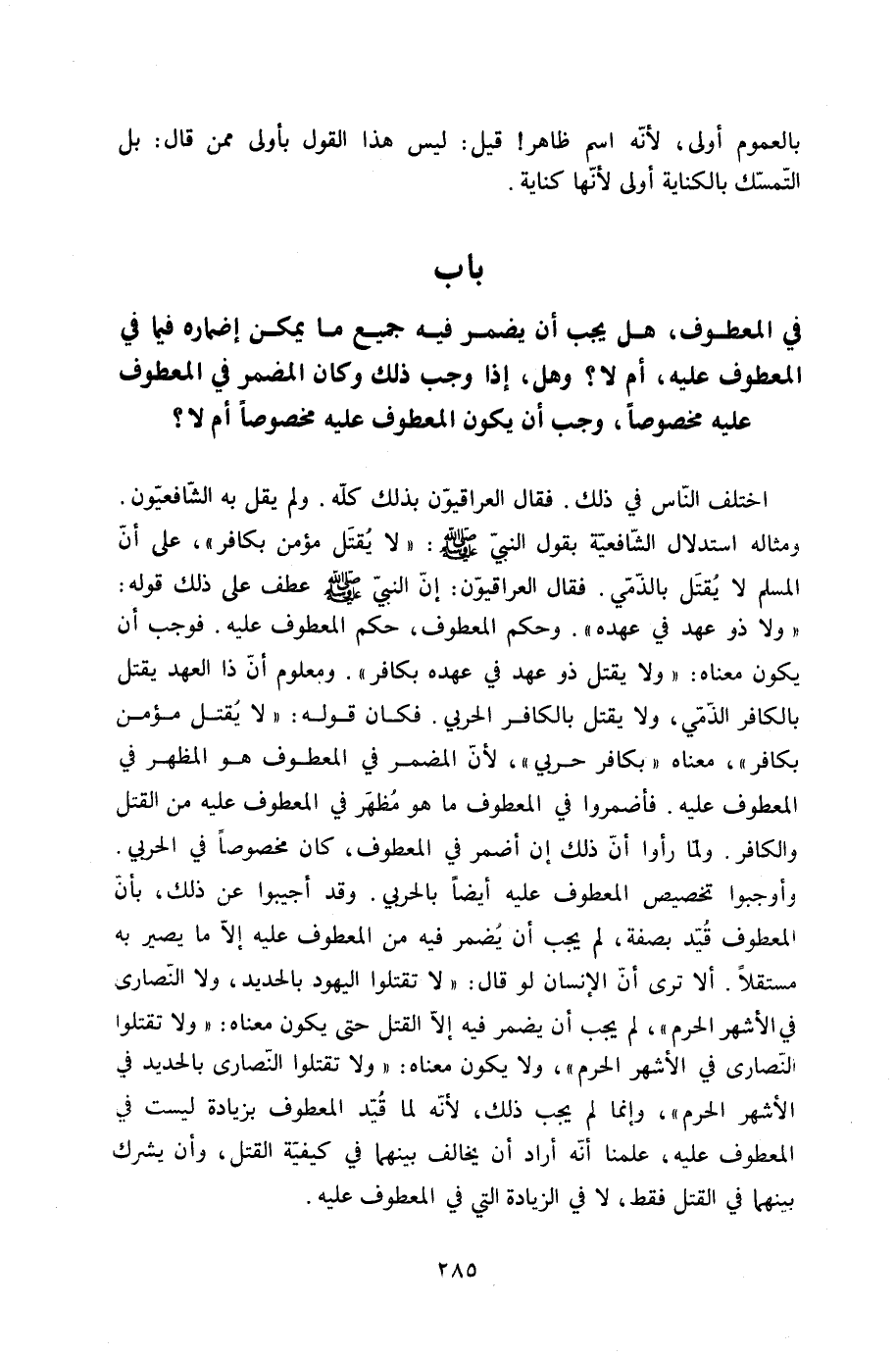 بِالْعُمُومِ أولى لِأَنَّهُ اسْم ظَاهر قيل لَيْسَ هَذَا القَوْل بِأولى مِمَّن قَالَ بل التَّمَسُّك بِالْكِنَايَةِ أولى لِأَنَّهَا كِنَايَة - صَلَّى اللَّهُ عَلَيْهِ وَسَلَّم َ - بَاب فِي الْمَعْطُوف هَل يجب أَن يضمر فِيهِ جَمِيع مَا يُمكن إضماره فِيمَا فِي الْمَعْطُوف عَلَيْهِ أم لَا وَهل إِذا وَجب ذَلِك وَكَانَ الْمُضمر فِي الْمَعْطُوف عَلَيْهِ مَخْصُوصًا وَجب أَن يكون الْمَعْطُوف عَلَيْهِ مَخْصُوصًا أم لَا - صَلَّى اللَّهُ عَلَيْهِ وَسَلَّم َ -
