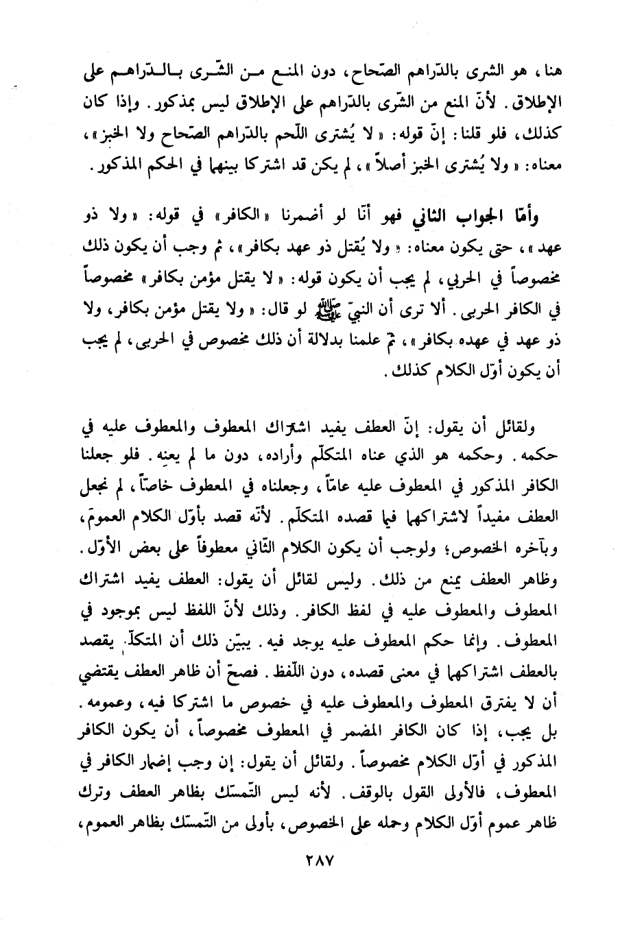 وَلقَائِل أَن يَقُول إِن الْعَطف يُفِيد اشْتِرَاك الْمَعْطُوف والمعطوف عَلَيْهِ فِي حكمه وَحكمه هُوَ الَّذِي عناه الْمُتَكَلّم وأراده دون مَا لم يعنه فَلَو جعلنَا الْكَافِر الْمَذْكُور فِي الْمَعْطُوف عَلَيْهِ عَاما وجعلناه فِي الْمَعْطُوف خَاصّا لم نجْعَل الْعَطف مُفِيدا لاشْتِرَاكهمَا فِيمَا قَصده الْمُتَكَلّم لِأَنَّهُ قصد بِأول الْكَلَام الْعُمُوم وبآخره الْخُصُوص ولوجب أَن يكون الْكَلَام الثَّانِي مَعْطُوفًا على بعض الأول وَظَاهر الْعَطف يمْنَع من ذَلِك وَلَيْسَ لقَائِل أَن يَقُول الْعَطف يُفِيد اشْتِرَاك الْمَعْطُوف والمعطوف عَلَيْهِ فِي لفظ الْكَافِر وَذَلِكَ لِأَن اللَّفْظ لَيْسَ بموجود فِي الْمَعْطُوف وَإِنَّمَا حكم الْمَعْطُوف عَلَيْهِ يُوجد فِيهِ يبين ذَلِك أَن الْمُتَكَلّم يقْصد بالْعَطْف اشتراكهما فِي معنى قَصده دون اللَّفْظ فصح أَن ظَاهر الْعَطف يَقْتَضِي أَن لَا يفْتَرق الْمَعْطُوف والمعطوف عَلَيْهِ فِي خُصُوص مَا اشْتَركَا فِيهِ وعمومه بل يجب إِذا كَانَ الْكَافِر الْمُضمر فِي الْمَعْطُوف مَخْصُوصًا أَن يكون الْكَافِر الْمَذْكُور فِي أول الْكَلَام مَخْصُوصًا وَلقَائِل أَن يَقُول إِن وَجب إِضْمَار الْكَافِر فِي الْمَعْطُوف فَالْأولى القَوْل بِالْوَقْفِ لِأَنَّهُ لَيْسَ التَّمَسُّك بِظَاهِر الْعَطف وَترك ظَاهر عُمُوم أول الْكَلَام وَحمله على الْخُصُوص بِأولى من التَّمَسُّك بِظَاهِر الْعُمُوم