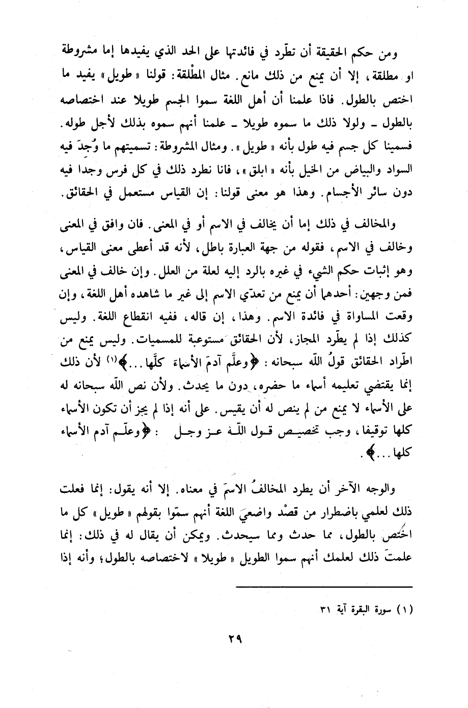 وَمن حكم الْحَقِيقَة أَن تطرد فِي فائدتها على الْحَد الَّذِي يفيدها إِمَّا مَشْرُوطَة أَو مُطلقَة إِلَّا أَن يمْنَع من ذَلِك مَانع مِثَال الْمُطلقَة قَوْلنَا طَوِيل يُفِيد مَا اخْتصَّ بالطول فَإِذا علمنَا أَن أهل اللُّغَة سموا الْجِسْم طَويلا عِنْد اخْتِصَاصه بالطول وَلَوْلَا ذَلِك مَا سموهُ طَويلا علمنَا أَنهم سموهُ بذلك لأجل طوله فسمينا كَا جسم فِيهِ طول بِأَنَّهُ طَوِيل وَمِثَال الْمَشْرُوطَة تسميتهم مَا وجد فِيهِ السوَاد وَالْبَيَاض من الْخَيل بانه ابلق فانا نطرد ذَلِك فِي كل فرس وجدا فِيهِ دون سَائِر الْأَجْسَام وَهَذَا هُوَ معنى قَوْلنَا إِن الْقيَاس مُسْتَعْمل فِي الْحَقَائِق