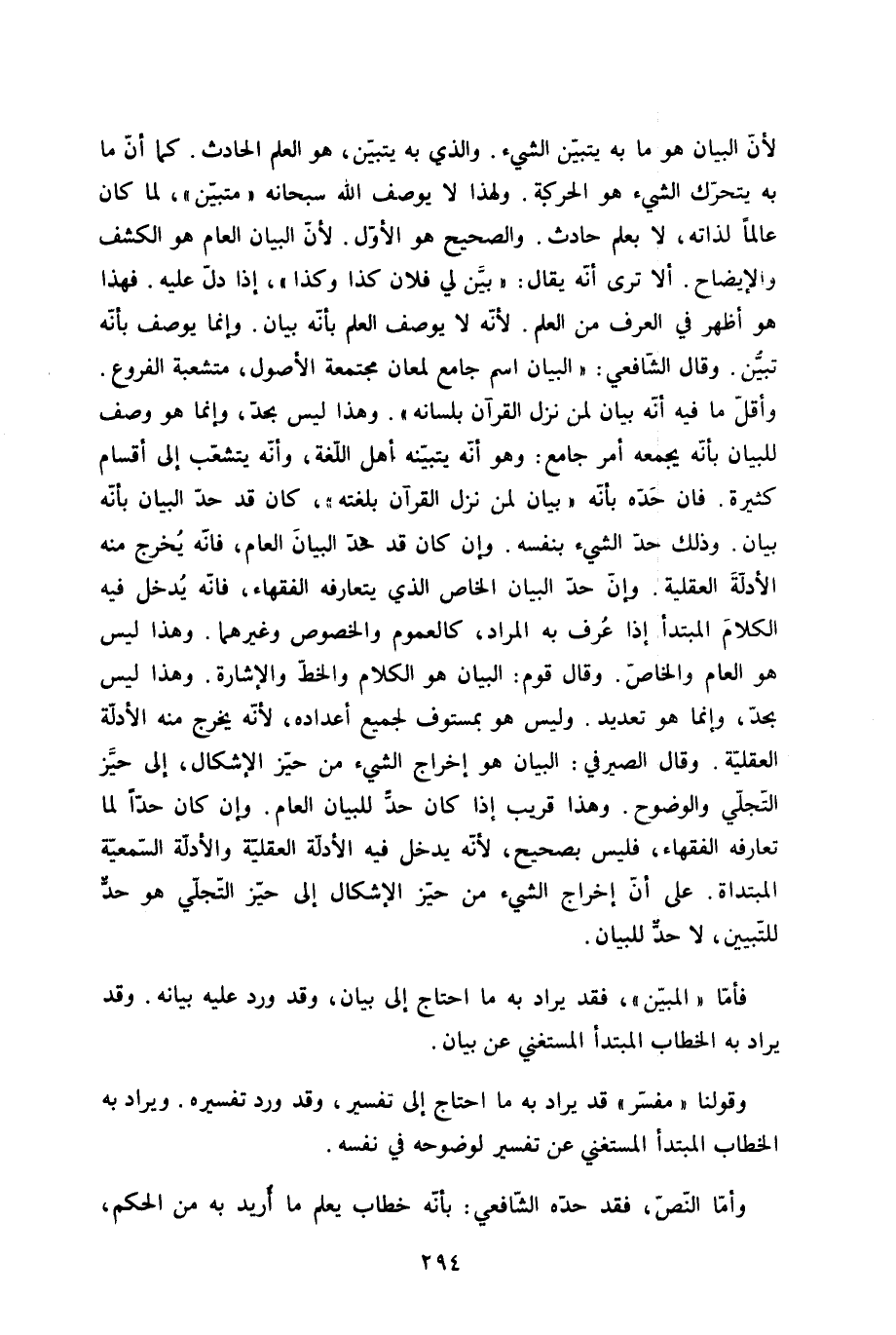 لِأَن الْبَيَان هُوَ مَا بِهِ يتَبَيَّن الشَّيْء وَالَّذِي بِهِ يتَبَيَّن هُوَ الْعلم الْحَادِث كَمَا أَن مَا بِهِ يَتَحَرَّك الشَّيْء هُوَ الْحَرَكَة وَلِهَذَا لَا يُوصف الله سُبْحَانَهُ متبين لما كَانَ عَالما لذاته لَا بِعلم حَادث وَالصَّحِيح هُوَ الأول لِأَن الْبَيَان الْعَام هُوَ الْكَشْف والإيضاح أَلا ترى أَنه يُقَال بَين لي فلَان كَذَا وَكَذَا إِذا دلّ عَلَيْهِ فَهَذَا هُوَ أظهر فِي الْعرف من الْعلم لِأَنَّهُ لَا يُوصف الْعلم بِأَنَّهُ بَيَان وَإِنَّمَا يُوصف بِأَنَّهُ تبين وَقَالَ الشَّافِعِي الْبَيَان اسْم جَامع لمعان مجتمعة الْأُصُول متشعبة الْفُرُوع وَأَقل مَا فِيهِ أَنه بَيَان لمن نزل الْقُرْآن بِلِسَانِهِ وَهَذَا لَيْسَ بِحَدّ وَإِنَّمَا هُوَ وصف للْبَيَان بِأَنَّهُ يجمعه أَمر جَامع وَهُوَ أَنه يتبينه أهل اللُّغَة وَأَنه يتشعب إِلَى أَقسَام كَثِيرَة فَإِن حَده بِأَنَّهُ بَيَان لمن نزل الْقُرْآن بلغته كَانَ قد حد الْبَيَان بِأَنَّهُ بَيَان وَذَلِكَ حد الشَّيْء بِنَفسِهِ وَإِن كَانَ قد حد الْبَيَان الْعَام فانه يخرج مِنْهُ الْأَدِلَّة الْعَقْلِيَّة وَإِن حد الْبَيَان الْخَاص الَّذِي يتعارفه الْفُقَهَاء فانه يدْخل فِيهِ الْكَلَام الْمُبْتَدَأ إِذا عرف بِهِ المُرَاد كالعموم وَالْخُصُوص وَغَيرهمَا وَهَذَا لَيْسَ هُوَ الْعَام وَالْخَاص وَقَالَ قوم الْبَيَان هُوَ الْكَلَام والخط وَالْإِشَارَة وَهَذَا لَيْسَ بِحَدّ وَإِنَّمَا هُوَ تعديد وَلَيْسَ هُوَ بمستوف لجَمِيع أعداده لِأَنَّهُ يخرج مِنْهُ الْأَدِلَّة الْعَقْلِيَّة وَقَالَ الصَّيْرَفِي الْبَيَان هُوَ إِخْرَاج الشَّيْء من حيّز الْإِشْكَال إِلَى حيّز التجلي والوضوح وَهَذَا قريب إِذا كَانَ حد للْبَيَان الْعَام وَإِن كَانَ حدا لما تعارفه الْفُقَهَاء فَلَيْسَ بِصَحِيح لِأَنَّهُ يدْخل فِيهِ الْأَدِلَّة الْعَقْلِيَّة والأدلة السمعية المبتداة على أَن إِخْرَاج الشَّيْء من حيّز الْإِشْكَال إِلَى حيّز التجلي هُوَ حد للتبيين لَا حد للْبَيَان