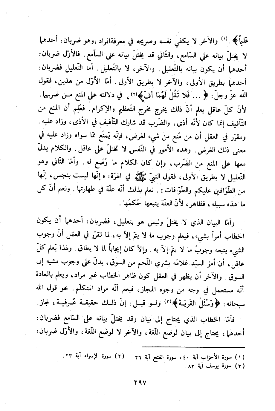 وَالْآخر لَا يَكْفِي نَفسه وصريحه فِي معرفَة المُرَاد وَهُوَ ضَرْبَان أَحدهمَا لَا يخْتل بَيَانه على السَّامع وَالثَّانِي قد يخْتل بَيَانه على السَّامع فَالْأول ضَرْبَان أَحدهمَا أَن يكون بَيَانه بِالتَّعْلِيلِ وَالْآخر لَا بِالتَّعْلِيلِ أما التَّعْلِيل فضربان أَحدهمَا بطرِيق الأولى وَالْآخر لَا بطرِيق الأولى أما الأول من هذَيْن فَقَوْل الله عز وَجل {فَلَا تقل لَهما أُفٍّ} فِي دلَالَته على الْمَنْع من ضربهما لِأَن كل عَاقل يعلم أَن ذَلِك يخرج مخرج التَّعْظِيم وَالْإِكْرَام فَعلم أَن الْمَنْع من التأفيف إِنَّمَا كَانَ لِأَنَّهُ أَذَى وَالضَّرْب قد شَارك التأفيف فِي الْأَذَى وَزَاد عَلَيْهِ ومقرر فِي الْعقل أَن من منع من شَيْء لغَرَض فَإِنَّهُ يمْنَع مِمَّا سواهُ وَزَاد عَلَيْهِ فِي معنى ذَلِك الْغَرَض وَهَذِه الْأُمُور فِي النَّفس لَا تختل على عَاقل وَالْكَلَام يدل مَعهَا على الْمَنْع من الضَّرْب وَإِن كَانَ الْكَلَام مَا وضع لَهُ وَأما الثَّانِي وَهُوَ التَّعْلِيل لَا بطرِيق الأولى فَقَوْل النَّبِي صلى الله عَلَيْهِ وَسلم فِي الْهِرَّة إِنَّهَا لَيست بِنَجس إِنَّهَا من الطوافين عَلَيْكُم والطوافات نعلم بذلك أَنه عِلّة فِي طَهَارَتهَا ونعلم أَن كل مَا هَذِه سَبيله فَظَاهر لِأَن الْعلَّة يتبعهَا حكمهَا