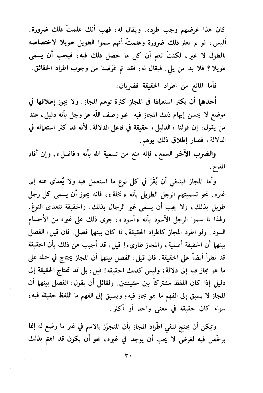 وَأما الْمجَاز فَيَنْبَغِي أَن يقر فِي كل نوع مَا اسْتعْمل فِيهِ وَلَا يعدى عَنهُ إِلَى غَيره نَحْو تسميتهم الرجل الطَّوِيل بِأَنَّهُ نَخْلَة فَإِنَّهُ يجوز أَن يُسمى كل رجل طَوِيل بذلك وَلَا يجب أَن يُسمى غير الرِّجَال بذلك والحقيقة تتعدى النَّوْع وَلِهَذَا لما سموا الرجل الْأسود بِأَنَّهُ أسود جرى ذَلِك على غَيره من الْأَجْسَام السود وَلَو اطرد الْمجَاز كاطراد الْحَقِيقَة لما كَانَ بَينهمَا فصل فَإِن قيل الْفَصْل بَينهمَا أَن الْحَقِيقَة أَصْلِيَّة وَالْمجَاز طارىء قيل قد أُجِيب عَن ذَلِك بِأَن الْحَقِيقَة قد تطرأ أَيْضا على الْحَقِيقَة فَإِن قيل الْفَصْل بَينهمَا أَن الْمجَاز يحْتَاج فِي حمله على مَا هُوَ مجَاز فِيهِ إِلَى دلَالَة وَلَيْسَ كَذَلِك الْحَقِيقَة قيل بل قد تحْتَاج الْحَقِيقَة إِلَى دَلِيل إِذا كَانَ اللَّفْظ مُشْتَركا بَين حقيقتين وَلقَائِل أَن يَقُول الْفَصْل بَينهمَا أَن الْمجَاز لَا يسْبق إِلَى الْفَهم مَا هُوَ مجَاز فِيهِ ويسبق إِلَى الْفَهم مَا اللَّفْظ حَقِيقَة فِيهِ سَوَاء كَانَ حَقِيقَة فِي معنى وَاحِد أَو اكثر