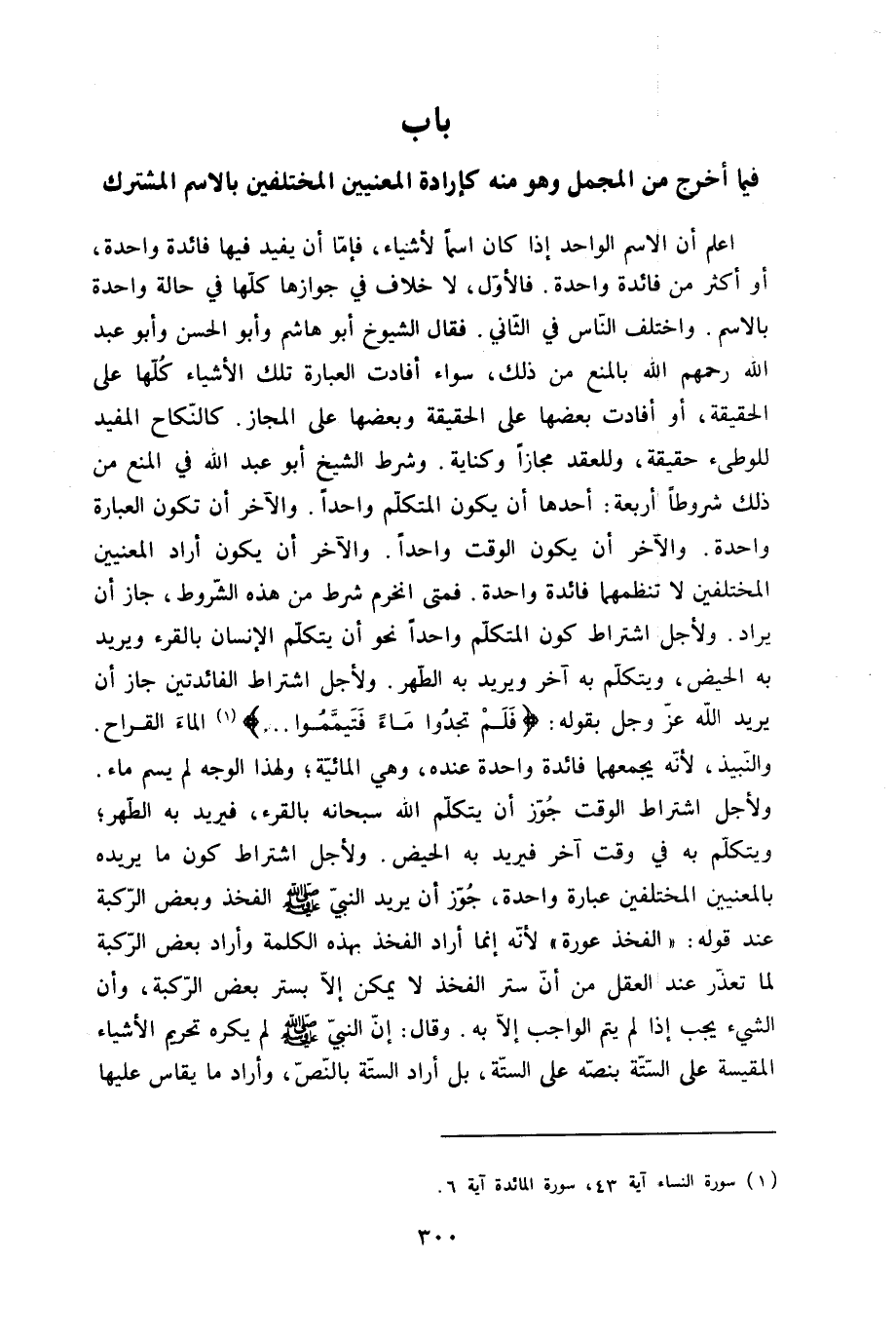 اعْلَم أَن الِاسْم الْوَاحِد إِذا كَانَ اسْما لِأَشْيَاء فإمَّا أَن يُفِيد فِيهَا فَائِدَة وَاحِدَة أَو أَكثر من فَائِدَة وَاحِدَة فَالْأول لَا خلاف فِي جَوَازهَا كلهَا فِي حَالَة وَاحِدَة بِالِاسْمِ وَاخْتلف النَّاس فِي الثَّانِي فَقَالَ الشُّيُوخ أَبُو هَاشم وابو الْحسن وَأَبُو عبد الله رَحِمهم الله بِالْمَنْعِ من ذَلِك سَوَاء أفادت الْعبارَة تِلْكَ الْأَشْيَاء كلهَا على الْحَقِيقَة أَو أفادت بَعْضهَا على الْحَقِيقَة وَبَعضهَا على الْمجَاز كَالنِّكَاحِ الْمُفِيد للوطىء حَقِيقَة وللعقد مجَازًا وكناية وَشرط الشَّيْخ أَبُو عبد الله فِي الْمَنْع من ذَلِك شُرُوطًا أَرْبَعَة أَحدهَا أَن يكون الْمُتَكَلّم وَاحِدًا وَالْآخر أَن تكون الْعبارَة وَاحِدَة وَالْآخر أَن يكون الْوَقْت وَاحِدًا وَالْآخر أَن يكون أَرَادَ الْمَعْنيين الْمُخْتَلِفين لَا تنظمهما فَائِدَة وَاحِدَة فَمَتَى انخرم شَرط من هَذِه الشُّرُوط جَازَ أَن يُرَاد وَلأَجل اشْتِرَاط كَون الْمُتَكَلّم وَاحِدًا نَحْو أَن يتَكَلَّم الْإِنْسَان بالقرء وَيُرِيد بِهِ الْحيض وَيتَكَلَّم بِهِ آخر وَيُرِيد بِهِ الطُّهْر وَلأَجل اشْتِرَاط الفائدتين جَازَ أَن يُرِيد الله عز وَجل بقوله {فَلم تَجدوا مَاء فَتَيَمَّمُوا} المَاء القراح والنبيذ لِأَنَّهُ يحمعهما فَائِدَة وَاحِدَة عِنْده وَهِي المائية وَلِهَذَا الْوَجْه لم يسم مَاء وَلأَجل اشْتِرَاط الْوَقْت جوز أَن يتَكَلَّم الله سُبْحَانَهُ بالقرء فيريد بِهِ الطُّهْر وَيتَكَلَّم بِهِ فِي وَقت آخر فيريد بِهِ الْحيض وَلأَجل اشْتِرَاط كَون مَا يُريدهُ بالمعنيين الْمُخْتَلِفين عبارَة وَاحِدَة جوز أَن يُرِيد النَّبِي صلى الله عَلَيْهِ وَسلم الْفَخْذ وَبَعض الرّكْبَة عِنْد قَوْله الْفَخْذ عَورَة لِأَنَّهُ إِنَّمَا أَرَادَ الْفَخْذ بِهَذِهِ الْكَلِمَة وَأَرَادَ بعض الرّكْبَة لما تعذر عِنْد الْعقل من أَن ستر الْفَخْذ لَا يُمكن إِلَّا بستر بعض الرّكْبَة وَأَن الشَّيْء يجب إِذا لم يتم الْوَاجِب إِلَّا بِهِ وَقَالَ إِن النَّبِي صلى الله عَلَيْهِ وَسلم لم يكره تَحْرِيم الْأَشْيَاء المقيسة على السِّتَّة بنصه على السِّتَّة بل أَرَادَ السِّتَّة بِالنَّصِّ وَأَرَادَ مَا يُقَاس عَلَيْهَا