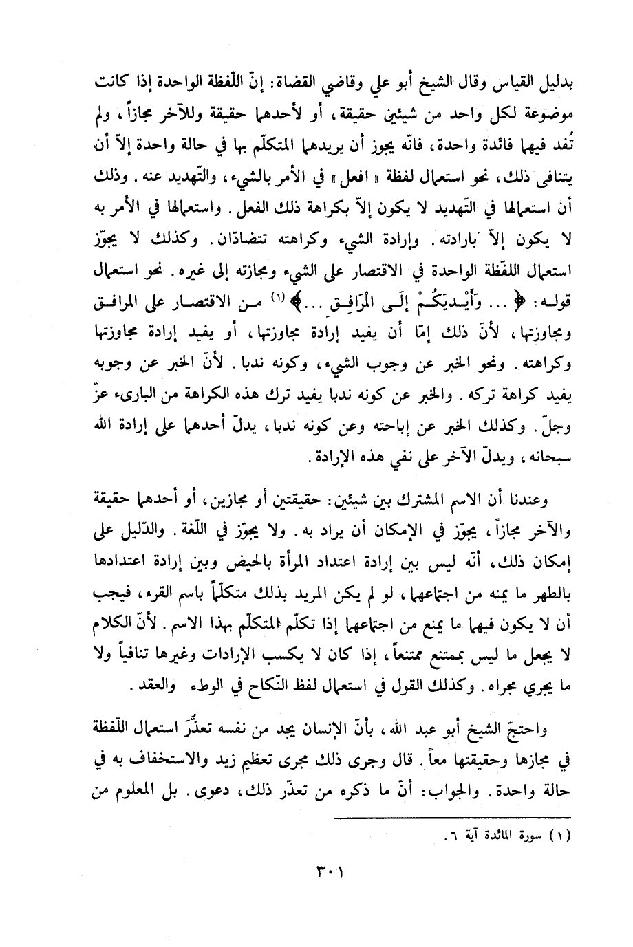 بِدَلِيل الْقيَاس وَقَالَ الشَّيْخ أَبُو عَليّ وقاضي الْقُضَاة إِن اللَّفْظَة الْوَاحِدَة إِذا كَانَت مَوْضُوعَة لكل وَاحِد من شَيْئَيْنِ حَقِيقَة أَو لأَحَدهمَا حَقِيقَة وَللْآخر مجَازًا وَلم تفد فيهمَا فَائِدَة وَاحِدَة فانه يجوز أَن يُرِيدهُمَا الْمُتَكَلّم بهَا فِي حَالَة وَاحِدَة إِلَّا أَن يتنافى ذَلِك نَحْو اسْتِعْمَال لَفْظَة افْعَل فِي الْأَمر بالشَّيْء والتهديد عَنهُ وَذَلِكَ أَن اسْتِعْمَالهَا فِي التهديد لَا يكون إِلَّا بِكَرَاهَة ذَلِك الْفِعْل واستعمالها فِي الْأَمر بِهِ لَا يكون إِلَّا بارادته وَإِرَادَة الشَّيْء وكراهته تتضادان وَكَذَلِكَ لَا يجوز اسْتِعْمَال اللَّفْظَة الْوَاحِدَة فِي الِاقْتِصَار على الشَّيْء ومجازته إِلَى غَيره نَحْو اسْتِعْمَال قَوْله {وَأَيْدِيكُمْ إِلَى الْمرَافِق} من الِاقْتِصَار على الْمرَافِق ومجاوزتها لِأَن ذَلِك إِمَّا أَن يُفِيد إِرَادَة مجاوزتها أَو يُفِيد إِرَادَة مجاوزتها وكراهته وَنَحْو الْخَبَر عَن وجوب الشَّيْء وَكَونه ندبا لِأَن الْخَبَر عَن وُجُوبه يُفِيد كَرَاهَة تَركه وَالْخَبَر عَن كَونه ندبا يُفِيد ترك هَذِه الْكَرَاهَة من البارىء عز وَجل وَكَذَلِكَ الْخَبَر عَن إِبَاحَته وَعَن كَونه ندبا يدل أَحدهمَا على إِرَادَة الله سُبْحَانَهُ وَيدل الآخر على نفي هَذِه الْإِرَادَة