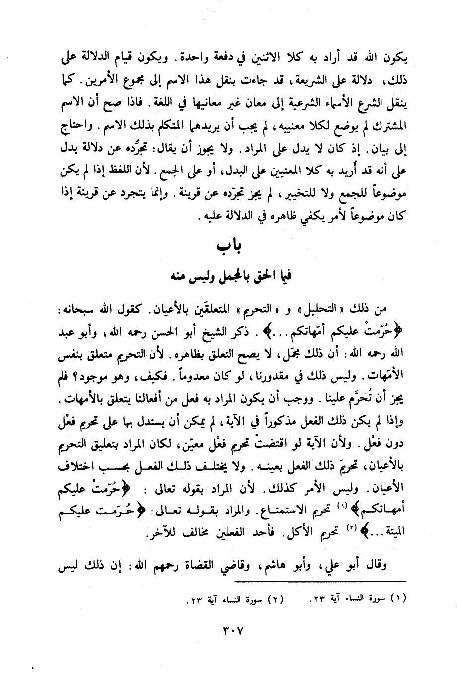 من ذَلِك التَّحْلِيل وَالتَّحْرِيم المتعلقين بالأعيان كَقَوْل الله سُبْحَانَهُ {حرمت عَلَيْكُم أُمَّهَاتكُم} ذكر الشَّيْخ ابو الْحسن رَحمَه الله وَأَبُو عبد الله رَحمَه الله أَن ذَلِك مُجمل لَا يَصح التَّعَلُّق بِظَاهِرِهِ لِأَن التَّحْرِيم مُتَعَلق بِنَفس الْأُمَّهَات وَلَيْسَ ذَلِك فِي مقدورنا لَو كَانَ مَعْدُوما فَكيف وَهُوَ مَوْجُود فَلم يجز أَن تحرم علينا وَوَجَب أَن يكون المُرَاد بِهِ فعل من أفعالنا يتَعَلَّق بالأمهات وَإِذا لم يكن ذَلِك الْفِعْل مَذْكُورا فِي الْآيَة لم يُمكن أَن يسْتَدلّ بهَا على تَحْرِيم فعل دون فعل وَلِأَن الْآيَة لَو اقْتَضَت تَحْرِيم فعل معِين لَكَانَ المُرَاد بتعليق التَّحْرِيم بالأعيان تَحْرِيم ذَلِك الْفِعْل بِعَيْنِه وَلَا يخْتَلف ذَلِك الْفِعْل بِحَسب اخْتِلَاف الْأَعْيَان وَلَيْسَ الْأَمر كَذَلِك لِأَن المُرَاد بقوله تَعَالَى {حرمت عَلَيْكُم أُمَّهَاتكُم} تَحْرِيم الِاسْتِمْتَاع وَالْمرَاد بقوله تَعَالَى {حرمت عَلَيْكُم الْميتَة} تَحْرِيم الْأكل فأحد الْفِعْلَيْنِ مُخَالف للْآخر