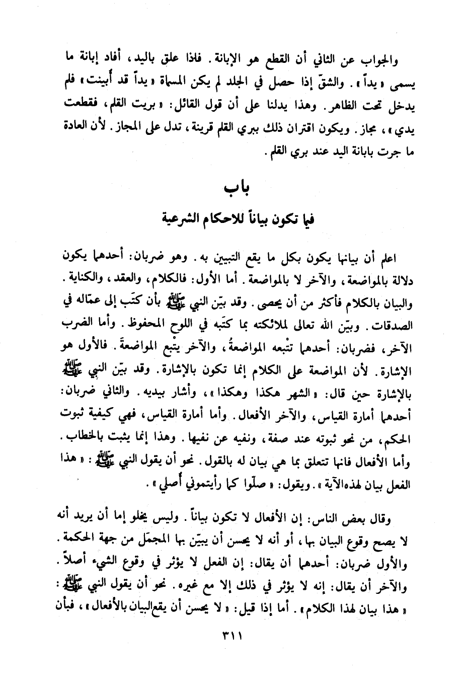 وَالْجَوَاب عَن الثَّانِي أَن الْقطع هُوَ الْإِبَانَة فاذا علق بِالْيَدِ أَفَادَ إبانة مَا يُسمى يدا والشق إذاحصل فِي الْجلد لم يكن الْمُسَمَّاة يدا قد أبينت فَلم يدْخل تَحت الظَّاهِر وَهَذَا يدلنا على أَن قَول الْقَائِل بريت الْقَلَم فَقطعت يَدي مجَاز وَيكون اقتران ذَلِك ببري الْقَلَم قرينَة تدل على الْمجَاز لِأَن الْعَادة مَا جريت بابانة عِنْد بري الْقَلَم - صَلَّى اللَّهُ عَلَيْهِ وَسَلَّم َ - بَاب فِيمَا تكون للاحكام الشَّرْعِيَّة - صَلَّى اللَّهُ عَلَيْهِ وَسَلَّم َ -