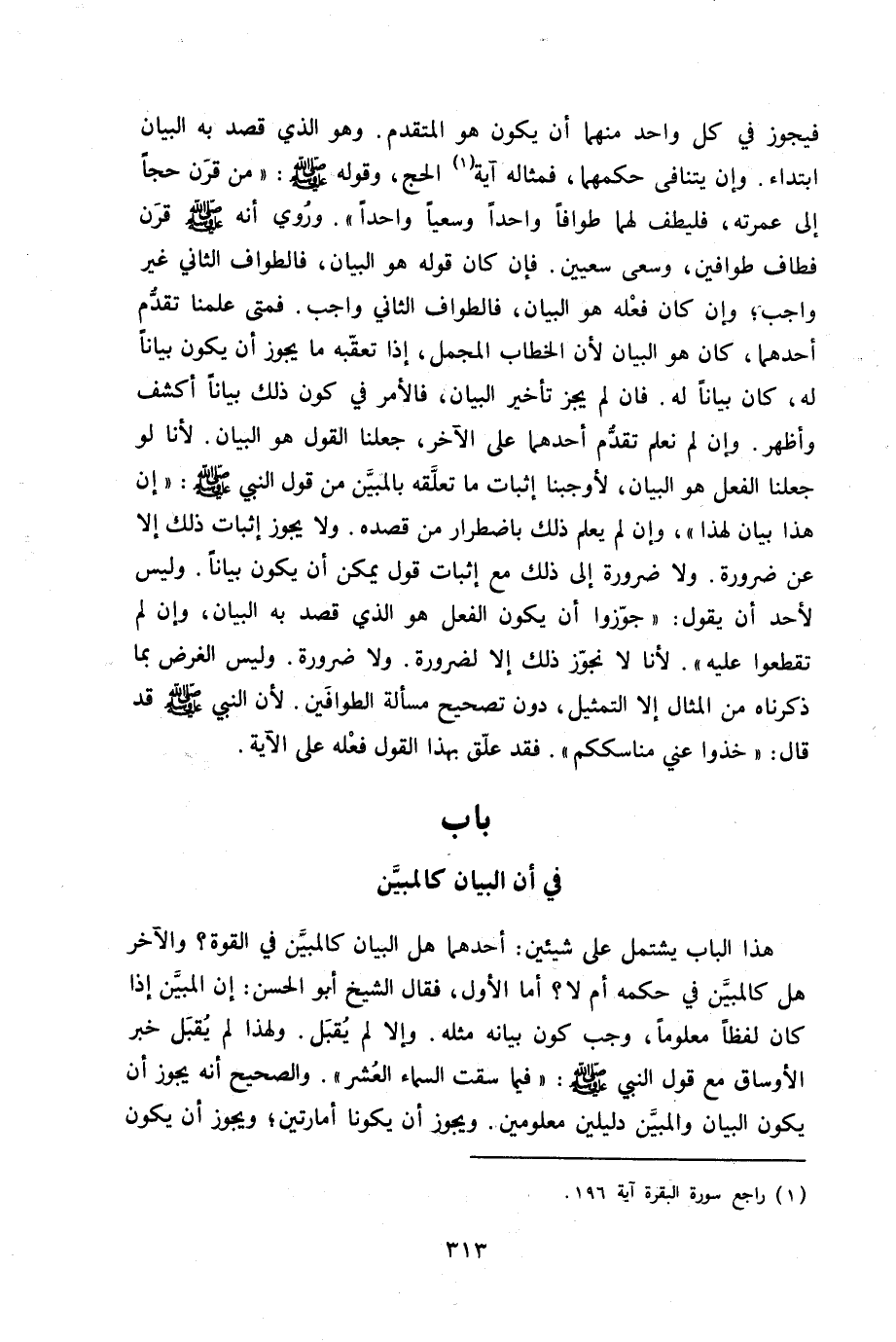 فَيجوز فِي كل وَاحِد مِنْهُمَا أَن يكون هُوَ الْمُتَقَدّم وَهُوَ الَّذِي قصد بِهِ الْبَيَان ابْتِدَاء وَإِن يتنافى حكمهمَا فمثاله آيَة الْحَج وَقَوله صلى الله عَلَيْهِ وَسلم من قرن حجا إِلَى عمرته فليطف لَهما طَوافا وَاحِدًا وسعيا وَاحِدًا وَرُوِيَ أَنه صلى الله عَلَيْهِ وَسلم قرن فَطَافَ طوافين وسعى سعيين فَإِن كَانَ قَوْله هُوَ الْبَيَان فالطواف الثَّانِي غير وَاجِب وَإِن كَانَ فعله هُوَ الْبَيَان فالطواف الثَّانِي وَاجِب فَمَتَى علمنَا تقدم أَحدهمَا كَانَ هُوَ الْبَيَان لِأَن الْخطاب الْمُجْمل إِذا تعقبه مَا يجوز أَن يكون بَيَانا لَهُ كَانَ بَيَان لَهُ فان لم يجز تَأْخِير الْبَيَان فَالْأَمْر فِي كَون ذَلِك بَيَانا أكشف وَأظْهر وَإِن لم نعلم تقدم أَحدهمَا على الآخر جعلنَا القَوْل هُوَ الْبَيَان لأَنا لَو جعلنَا الْفِعْل هُوَ الْبَيَان لأوجبنا إِثْبَات مَا تعلقه بالمبين من قَول النَّبِي صلى الله عَلَيْهِ وَسلم إِن هَذَا بَيَان لهَذَا وَإِن لم يعلم ذَلِك باضطرار من قَصده وَلَا يجوز إِثْبَات ذَلِك إِلَّا عَن ضَرُورَة وَلَا ضَرُورَة إِلَى ذَلِك مَعَ إِثْبَات قَول يُمكن أَن يكون بَيَانا وَلَيْسَ لأحد أَن يَقُول جوزوا أَن يكون الْفِعْل هُوَ الَّذِي قصد بِهِ الْبَيَان وَإِن لم تقطعوا عَلَيْهِ لأَنا لَا نجوز ذَلِك إِلَّا لضَرُورَة وَلَا ضَرُورَة وَلَيْسَ الْغَرَض بِمَا ذَكرْنَاهُ من الْمِثَال إِلَّا التَّمْثِيل دون تَصْحِيح مَسْأَلَة الطوافين لِأَن النَّبِي صلى الله عَلَيْهِ وَسلم قد قَالَ خُذُوا عني مَنَاسِككُم فقد علق بِهَذَا القَوْل فعله على الْآيَة - صَلَّى اللَّهُ عَلَيْهِ وَسَلَّم َ - بَاب فِي أَن الْبَيَان كالمبين - صَلَّى اللَّهُ عَلَيْهِ وَسَلَّم َ -