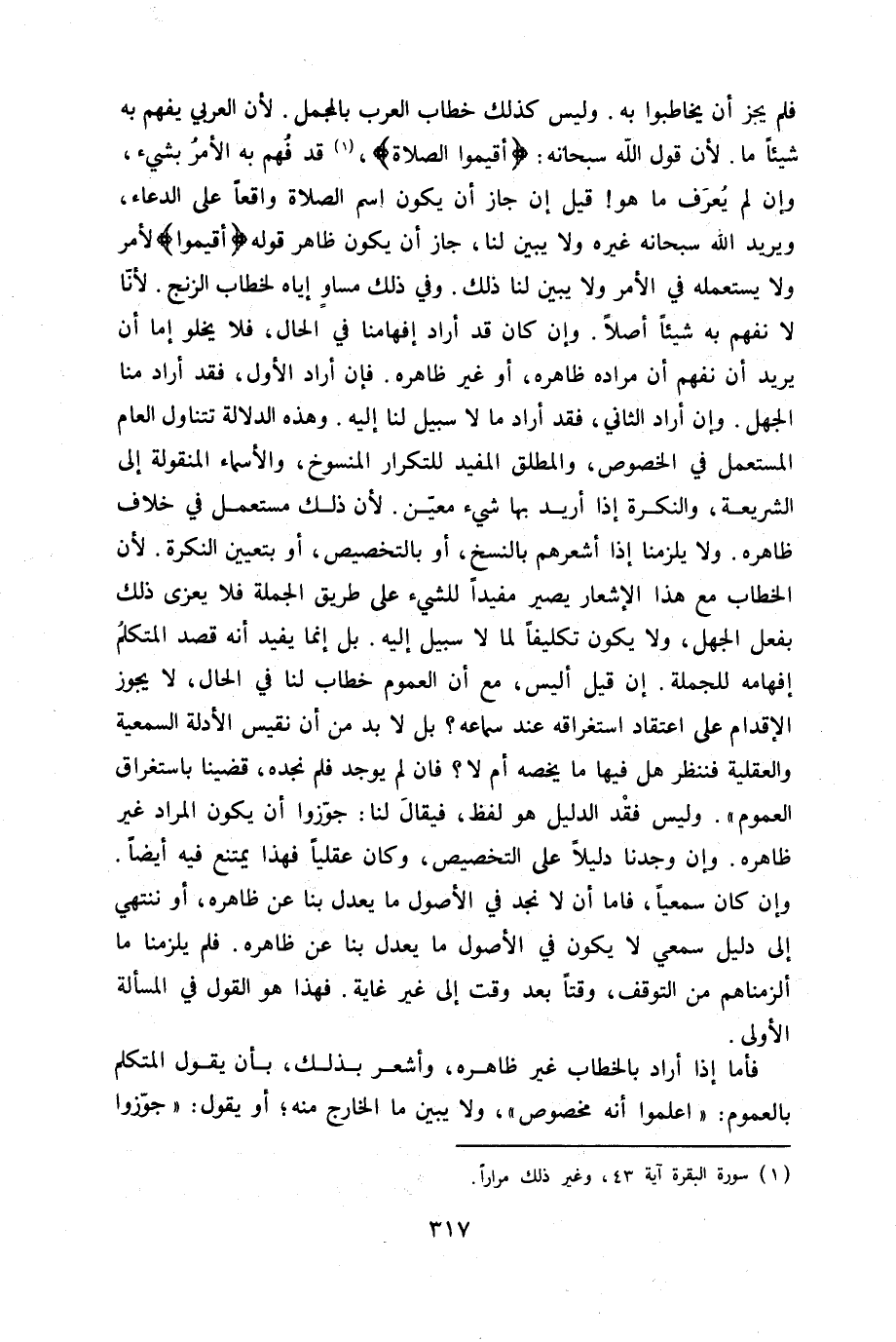فَلم يجز أَن يخاطبوا بِهِ وَلَيْسَ كَذَلِك خطاب الْعَرَب بالمجمل لِأَن الْعَرَبِيّ يفهم بِهِ شَيْئا مَا لِأَن قَول الله سُبْحَانَهُ {أقِيمُوا الصَّلَاة} قد فهم بِهِ الْأَمر بِشَيْء وَإِن لم يعرف مَا هُوَ قيل إِن جَازَ أَن يكون اسْم الصَّلَاة وَاقعا على الدُّعَاء وَيُرِيد الله سُبْحَانَهُ غَيره وَلَا يبين لنا جَازَ أَن يكون ظَاهره قَوْله {أقِيمُوا} لأمر وَلَا يَسْتَعْمِلهُ فِي الْأَمر وَلَا يبين لنا ذَلِك وَفِي ذَلِك مسَاوٍ إِيَّاه لخطاب الزنج لأَنا لَا نفهم بِهِ شَيْئا أصلا وَإِن كَانَ قد أَرَادَ إفهامنا فِي الْحَال فَلَا يَخْلُو إِمَّا أَن يُرِيد أَن نفهم أَن مُرَاده ظَاهره أَو غير ظَاهره فَإِن أَرَادَ الأول فقد أَرَادَ منا الْجَهْل وَإِن أَرَادَ الثَّانِي فقد أَرَادَ مَا لَا سَبِيل لنا إِلَيْهِ وَهَذِه الدّلَالَة تتَنَاوَل الْعَام الْمُسْتَعْمل فِي الْخُصُوص وَالْمُطلق الْمُفِيد للتكرار الْمَنْسُوخ والأسماء المنقولة إِلَى الشَّرِيعَة والنكرة إِذا أُرِيد بهَا شَيْء معِين لِأَن ذَلِك مُسْتَعْمل فِي خلاف ظَاهره وَلَا يلْزمنَا إِذا أشعرهم بالنسخ أَو بالتخصيص أَو بِتَعْيِين النكرَة لِأَن الْخطاب مَعَ هَذَا الْإِشْعَار يصير مُفِيدا للشَّيْء على طَرِيق الْجُمْلَة فَلَا يعزى ذَلِك بِفعل الْجَهْل وَلَا يكون تكليفا لما لَا سَبِيل إِلَيْهِ بل إِنَّمَا يُفِيد أَنه قصد الْمُتَكَلّم إفهامه للجملة إِن قيل أَلَيْسَ مَعَ أَن الْعُمُوم خطاب لنا فِي الْحَال لَا يجوز الْإِقْدَام على اعْتِقَاد استغراقه عِنْد سَمَاعه بل لَا بُد من أَن نقيس الْأَدِلَّة السمعية والعقلية فَنَنْظُر هَل فِيهَا مَا يَخُصُّهُ أم لَا فان لم يُوجد فَلم نجده قضينا باستغراق الْعُمُوم وَلَيْسَ فقد الدَّلِيل هُوَ لفظ فَيُقَال لنا جوزوا أَن يكون المُرَاد غير ظَاهره وَإِن وجدنَا دَلِيلا على التَّخْصِيص وَكَانَ عقليا فَهَذَا يمْتَنع فِيهِ ايضا وَإِن كَانَ سمعيا فاما أَن لَا نجد فِي الْأُصُول مَا يعدل بِنَا عَن ظَاهره أَو ننتهي إِلَى دَلِيل سَمْعِي لَا يكون فِي الْأُصُول مَا يعدل بِنَا عَن ظَاهره فَلم يلْزمنَا مَا ألزمناهم من التَّوَقُّف وقتا بعد وَقت إِلَى غير غَايَة فَهَذَا هُوَ القَوْل فِي الْمَسْأَلَة الأولى