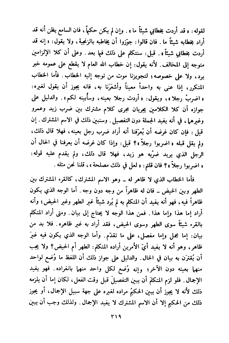 فَأَما الْخطاب الَّذِي لَا ظَاهر لَهُ وَهُوَ الِاسْم الْمُشْتَرك كالقرء الْمُشْتَرك بَين الطُّهْر وَبَين الْحيض فان لَهُ ظَاهرا من وَجه دون وَجه أما الْوَجْه الَّذِي يكون ظَاهرا فِيهِ فَهُوَ أَنه يُفِيد أَن الْمُتَكَلّم بِهِ لم يرد شَيْئا غير الطُّهْر وَغير الْحيض وَأَنه أَرَادَ إِمَّا هَذَا وَإِمَّا هَذَا فَمن هَذَا الْوَجْه لَا يحْتَاج إِلَى بَيَان وَمَتى أَرَادَ الْمُتَكَلّم بالقرء شَيْئا سوى الطُّهْر وَسوى الْحيض فقد أَرَادَ بِهِ غير ظَاهره فَلَا بُد من بَيَان إِمَّا مُجمل وَإِمَّا مفصل على مَا تقدم وَأما الْوَجْه الَّذِي يكون فِيهِ غير ظَاهر وَهُوَ أَنه لَا يُفِيد أَي الْأَمريْنِ أَرَادَهُ الْمُتَكَلّم الطُّهْر أم الْحيض وَلَا يجب أَن يقْتَرن بِهِ بَيَان فِي الْحَال وَالدَّلِيل على جَوَاز ذَلِك أَن اللَّفْظ مَا وضع لوَاحِد مِنْهُمَا بِعَيْنِه دون الآخر وَإنَّهُ وضع لكل وَاحِد مِنْهُمَا بِانْفِرَادِهِ فَهُوَ يُفِيد الْإِجْمَال فَلَو لزم الْمُتَكَلّم أَن يبين التَّفْصِيل قبل وَقت الْفِعْل لَكَانَ إِمَّا أَن يلْزمه ذَلِك لِأَنَّهُ لَا يجوز أَن يبين الْحَكِيم مُرَاده لغيره على جِهَة سَبِيل الْإِجْمَال أَو يجوز ذَلِك من الْحَكِيم إِلَّا أَن الِاسْم الْمُشْتَرك لَا يُفِيد الْإِجْمَال وَلذَلِك وَجب أَن يبين