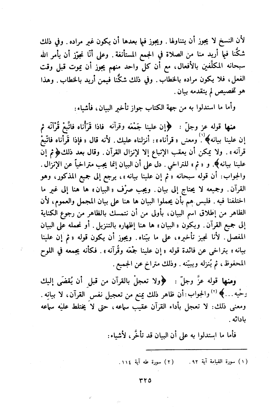 مِنْهَا قَوْله عز وَجل {إِن علينا جمعه وقرآنه فَإِذا قرأناه فَاتبع قرآنه ثمَّ إِن علينا بَيَانه} وَمعنى قرأناه أَنزَلْنَاهُ عَلَيْك لِأَنَّهُ قَالَ فاذا قرأناه فَاتبع قرآنه وَلَا يُمكن أَن يعقب الإتباع إِلَّا لإنزال الْقُرْآن وَقَالَ بعد ذَلِك {ثمَّ إِن علينا بَيَانه} وَثمّ للتراخي دلّ على أَن الْبَيَان إِنَّمَا يجب متراخيا عَن الْإِنْزَال وَالْجَوَاب أَن قَوْله سُبْحَانَهُ ثمَّ إِن علينا بَيَانه يرجع إِلَى جَمِيع الْمَذْكُور وَهُوَ الْقُرْآن وجميعه لَا يحْتَاج إِلَى بَيَان وَيجب صرف الْبَيَان هَا هُنَا إِلَى غير مَا اخْتَلَفْنَا فِيهِ فَلَيْسَ هم بِأَن يحملوا الْبَيَان هَا هُنَا على بَيَان الْمُجْمل والعموم لِأَن الظَّاهِر من إِطْلَاق اسْم الْبَيَان بِأولى من أَن نتمسك بِالظَّاهِرِ من رُجُوع الْكِنَايَة إِلَى جَمِيع الْقُرْآن وَيكون الْبَيَان هَا هُنَا إِظْهَاره بالتنزيل أَو نحمله على الْبَيَان الْمفصل لأَنا نجيز تَأْخِيره على مَا بَيناهُ وَيجوز أَن يكون قَوْله ثمَّ أَن علينا بَيَانه يتراخى عَن فَائِدَة قَوْله إِن علينا جمعه وقرآنه فَكَأَنَّهُ يجمعه فِي اللَّوْح الْمَحْفُوظ ثمَّ ينزله ويبينه وَذَلِكَ متراخ عَن الْجَمِيع