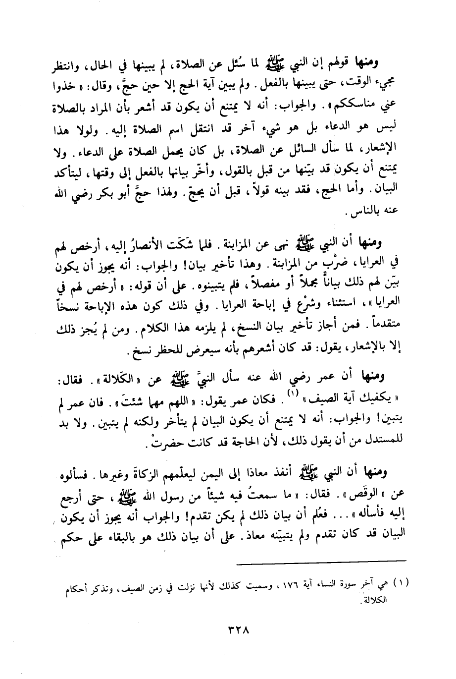 وَمِنْهَا أَن عمر رَضِي الله عَنهُ سَأَلَ النَّبِي صلى الله عَلَيْهِ وَسلم عَن الْكَلَالَة فَقَالَ يَكْفِيك آيَة الصَّيف فَكَانَ عمر يَقُول اللَّهُمَّ مهما شِئْت فان عمر لم يتَبَيَّن وَالْجَوَاب أَنه لَا يمْتَنع أَن يكون الْبَيَان لم يتَأَخَّر وَلكنه لم يتَبَيَّن وَلَا بُد للمستدل من أَن يَقُول ذَلِك لِأَن الْحَاجة قد كَانَت حضرت