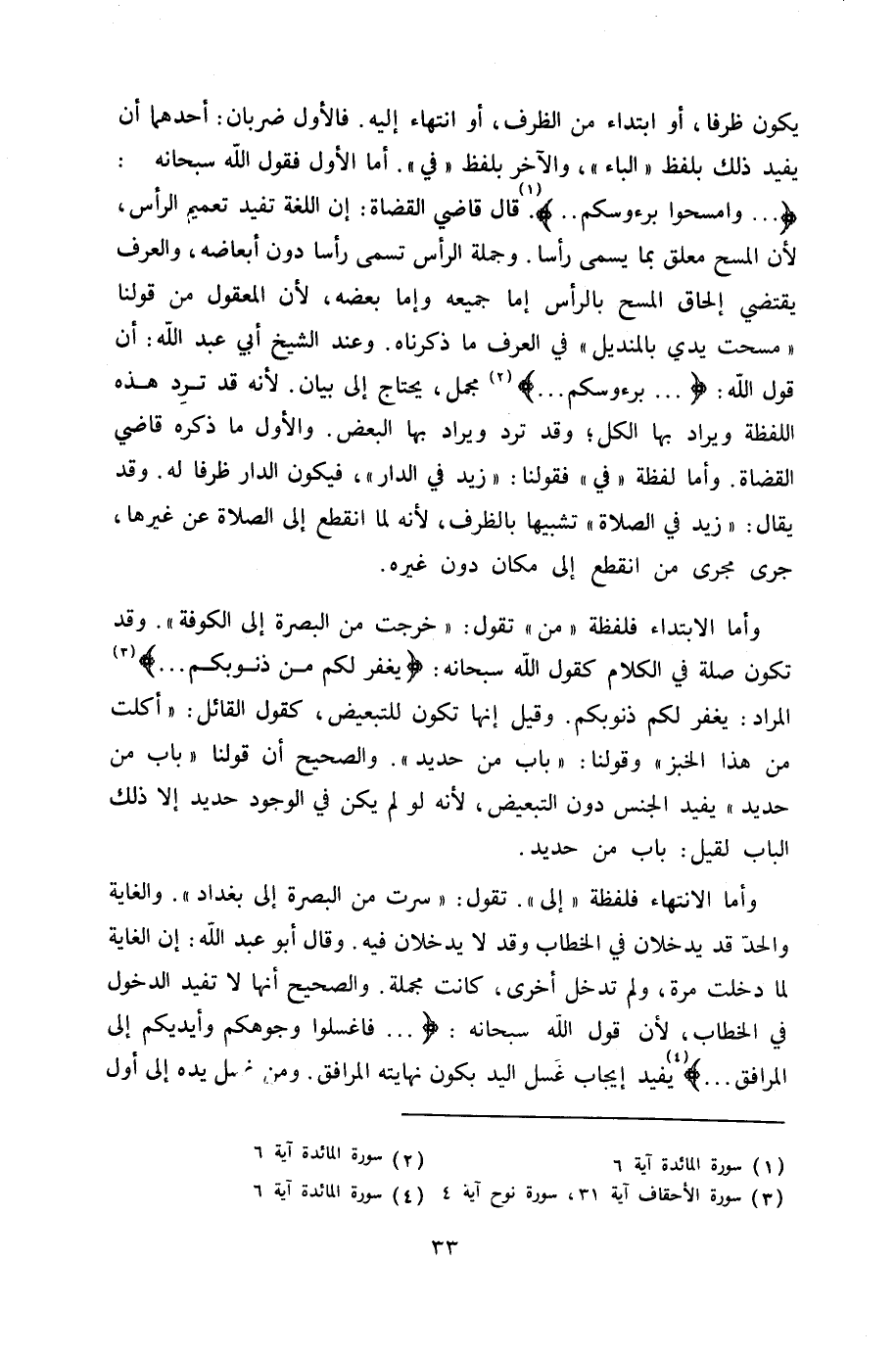 يكون ظرفا أَو ابْتِدَاء من الظّرْف أَو انْتِهَاء إِلَيْهِ فَالْأول ضَرْبَان أَحدهمَا أَن يُفِيد ذَلِك بِلَفْظ الْبَاء وَالْآخر بِلَفْظ فِي أما الأول فَقَوْل الله سُبْحَانَهُ {وامسحوا برؤوسكم} قَالَ قَاضِي الْقُضَاة إِن اللُّغَة تفِيد تَعْمِيم الرَّأْس لِأَن الْمسْح مُعَلّق بِمَا يُسمى رَأْسا وَجُمْلَة الرَّأْس تسمى رَأْسا دون أَبْعَاضه وَالْعرْف يَقْتَضِي إِلْحَاق الْمسْح بِالرَّأْسِ إِمَّا جَمِيعه وَإِمَّا بعضه لِأَن الْمَعْقُول من قَوْلنَا مسحت يَدي بالمنديل فِي الْعرف مَا ذَكرْنَاهُ وَعند الشَّيْخ أبي عبد الله أَن قَول الله {برؤوسكم} مُجمل يحْتَاج إِلَى بَيَان لِأَنَّهُ قد ترد هَذِه اللَّفْظَة وَيُرَاد بهَا الْكل وَقد ترد وَيُرَاد بهَا الْبَعْض وَالْأول مَا ذكره قَاضِي الْقُضَاة وَأما لَفظه فِي فقولنا زيد فِي الدارفيكون الدَّار ظرفا لَهُ وَقد يُقَال زيد فِي الصَّلَاة تَشْبِيها بالظرف لِأَنَّهُ لما انْقَطع إِلَى الصَّلَاة عَن غَيرهَا جرى مجْرى من انْقَطع إِلَى مَكَان دون غَيره