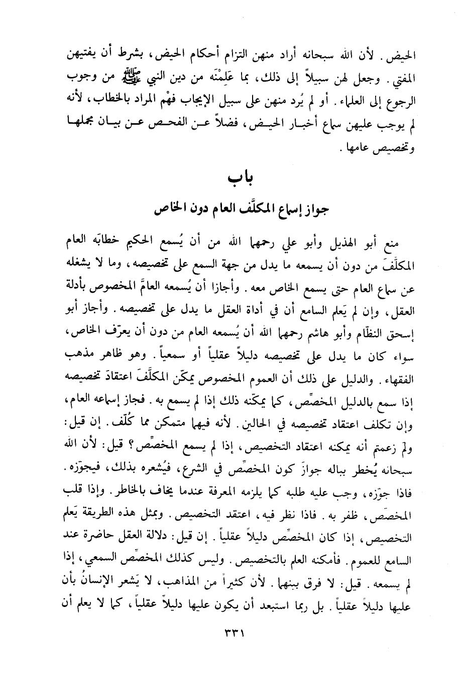 الْحيض لِأَن الله سُبْحَانَهُ أَرَادَ مِنْهُنَّ الْتِزَام أَحْكَام الْحيض بِشَرْط أَن يفتيهن الْمُفْتِي وَجعل لَهُنَّ سَبِيلا إِلَى ذَلِك بِمَا علمنه من دين النَّبِي صلى الله عَلَيْهِ وَسلم من وجوب الرُّجُوع إِلَى الْعلمَاء أَو لم يرد مِنْهُنَّ على سَبِيل الْإِيجَاب فهم المُرَاد بِالْخِطَابِ لِأَنَّهُ لم يُوجب عَلَيْهِنَّ سَماع أَخْبَار الْحيض فضلا عَن الفحص عَن بَيَان مجملها وَتَخْصِيص عامها - صَلَّى اللَّهُ عَلَيْهِ وَسَلَّم َ - بَاب جَوَاز إسماع الْمُكَلف الْعَام دون الْخَاص - صَلَّى اللَّهُ عَلَيْهِ وَسَلَّم َ -