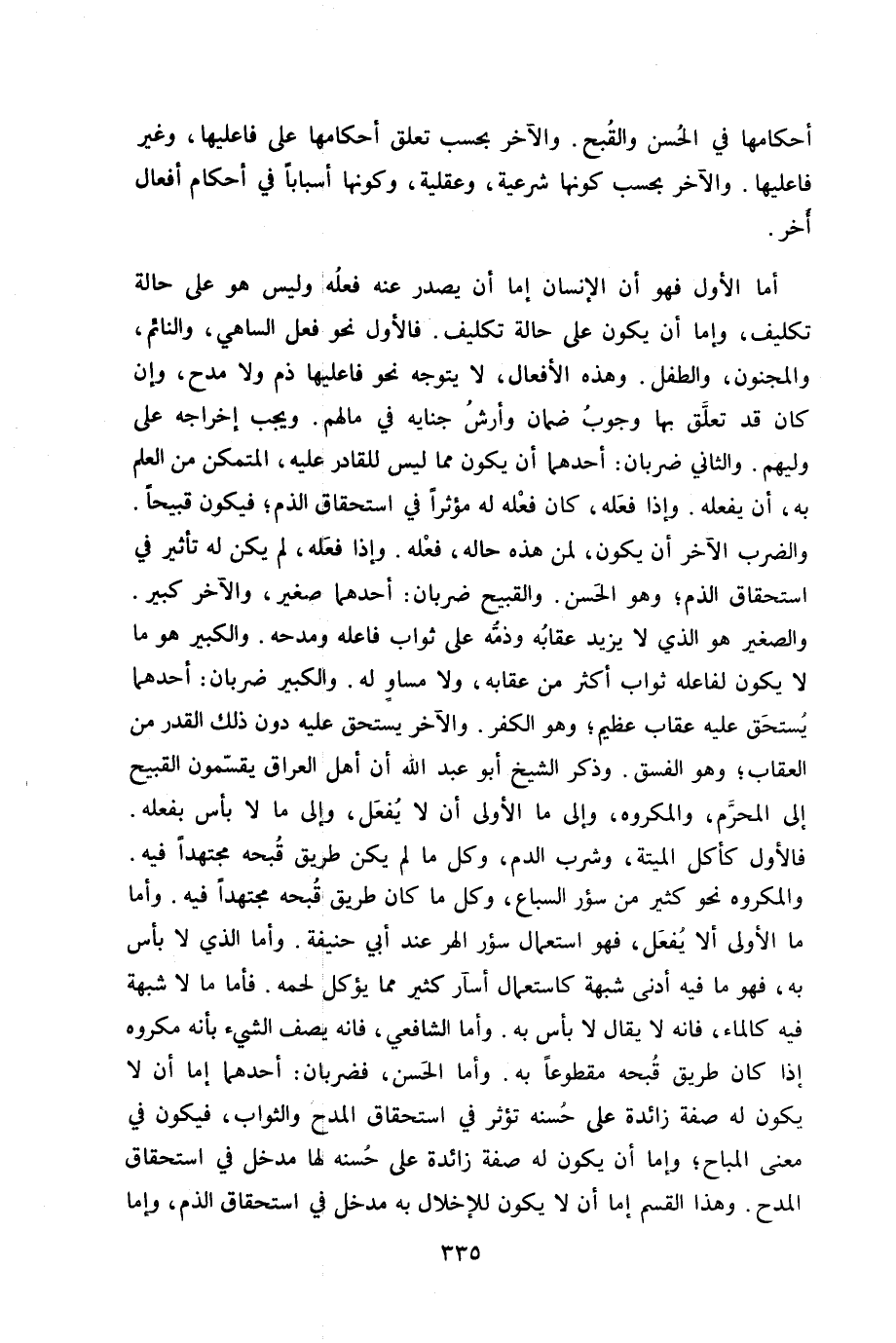 أما الأول فَهُوَ أَن الْإِنْسَان إِمَّا أَن يصدر عَنهُ فعله وَلَيْسَ هُوَ على حَالَة تَكْلِيف وَإِمَّا أَن يكون على حَالَة تَكْلِيف فَالْأول نَحْو فعل الساهي والنائم وَالْمَجْنُون والطفل وَهَذِه الْأَفْعَال لَا يتَوَجَّه نَحْو فاعليها ذمّ وَلَا مدح وَإِن كَانَ قد تعلق بهَا وجوب ضَمَان وَأرش جنايه فِي مَالهم وَيجب إِخْرَاجه على وليهم وَالثَّانِي ضَرْبَان أَحدهمَا أَن يكون مِمَّا لَيْسَ للقادر عَلَيْهِ المتمكن من الْعلم بِهِ أَن يَفْعَله وَإِذا فعله كَانَ فعله لَهُ مؤثرا فِي اسْتِحْقَاق الذَّم فَيكون قبيحا وَالضَّرْب الآخر أَن يكون لمن هَذِه حَاله فعله وَإِذا فعله لم يكن لَهُ تاثير فِي اسْتِحْقَاق الذَّم وَهُوَ الْحسن والقبيح ضَرْبَان أَحدهمَا صَغِير وَالْآخر كَبِير وَالصَّغِير هُوَ الَّذِي لَا يزِيد عِقَابه وذمه على ثَوَاب فَاعله ومدحه وَالْكَبِير هُوَ مَا لَا يكون لفَاعِله ثَوَاب أَكثر من عِقَابه وَلَا مسَاوٍ لَهُ وَالْكَبِير ضَرْبَان أَحدهمَا يسْتَحق عَلَيْهِ عِقَاب عَظِيم وَهُوَ الْكفْر وَالْآخر يسْتَحق عَلَيْهِ دون ذَلِك الْقدر من الْعقَاب وَهُوَ الْفسق وَذكر الشَّيْخ أَبُو عبد الله أَن أهل الْعرَاق يقسمون الْقَبِيح إِلَى الْمحرم وَالْمَكْرُوه وَإِلَى مَا الأولى أَن لَا يفعل وَإِلَى مَا لَا بَأْس بِفِعْلِهِ فَالْأول كَأَكْل الْميتَة وَشرب الدَّم وكل مَا لم يكن طَرِيق قبحه مُجْتَهدا فِيهِ وَالْمَكْرُوه نَحْو كثير من سُؤْر السبَاع وكل مَا كَانَ طَرِيق قبحه مُجْتَهدا فِيهِ وَأما مَا الأولى أَلا يفعل فَهُوَ اسْتِعْمَال سُؤْر الهر عِنْد أبي حنيفَة وَأما الَّذِي لَا بَأْس بِهِ فَهُوَ مَا فِيهِ أدنى شُبْهَة كاستعمال أسآر كثير مِمَّا يُؤْكَل لَحْمه فَأَما مَا لَا شُبْهَة فِيهِ كَالْمَاءِ فانه لَا يُقَال لَا بَأْس بِهِ وَأما الشَّافِعِي فانه يصف الشَّيْء بِأَنَّهُ مَكْرُوه إِذا كَانَ طَرِيق قبحه مَقْطُوعًا بِهِ وَأما الْحسن فضربان أَحدهمَا إِمَّا أَن لَا يكون لَهُ صفة زَائِدَة على حسنه تُؤثر فِي اسْتِحْقَاق الْمَدْح وَالثَّوَاب فَيكون فِي معنى الْمُبَاح وَإِمَّا أَن يكون لَهُ صفة زَائِدَة على حسنه لَهَا مدْخل فِي اسْتِحْقَاق الْمَدْح وَهَذَا الْقسم إِمَّا أَن لَا يكون للإخلال بِهِ مدْخل فِي اسْتِحْقَاق الذَّم وَإِمَّا