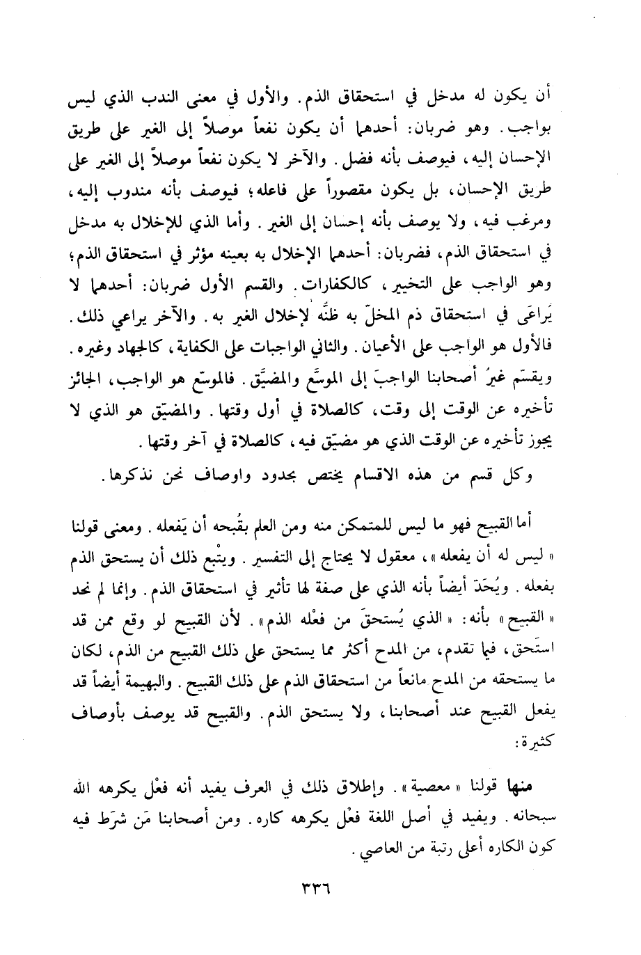 أَن يكون لَهُ مدْخل فِي اسْتِحْقَاق الذَّم وَالْأول فِي معنى النّدب الَّذِي لَيْسَ بِوَاجِب وَهُوَ ضَرْبَان أَحدهمَا أَن يكون نفعا موصلا إِلَى الْغَيْر على طَرِيق الْإِحْسَان إِلَيْهِ فيوصف بِأَنَّهُ فضل وَالْآخر لَا يكون نفعا موصلا إِلَى الْغَيْر على طَرِيق الْإِحْسَان بل يكون مَقْصُورا على فَاعله فيوصف بِأَنَّهُ مَنْدُوب إِلَيْهِ ومرغب فِيهِ وَلَا يُوصف بِأَنَّهُ إِحْسَان إِلَى الْغَيْر وَأما الَّذِي للإخلال بِهِ مدْخل فِي اسْتِحْقَاق الذَّم فضربان أَحدهمَا الْإِخْلَال بِهِ بِعَيْنِه مُؤثر فِي اسْتِحْقَاق الذَّم وَهُوَ الْوَاجِب على التَّخْيِير كالكفارات وَالْقسم الأول ضَرْبَان أَحدهمَا لَا يُرَاعى فِي اسْتِحْقَاق ذمّ المخل بِهِ ظَنّه لإخلال الْغَيْر بِهِ وَالْآخر يُرَاعِي ذَلِك فَالْأول هُوَ الْوَاجِب على الْأَعْيَان وَالثَّانِي الْوَاجِبَات على الْكِفَايَة كالجهاد وَغَيره وَيقسم غير أَصْحَابنَا الْوَاجِب إِلَى الموسع والمضيق فالموسع هُوَ الْوَاجِب الْجَائِز تَأْخِيره عَن الْوَقْت إِلَى وَقت كَالصَّلَاةِ فِي أول وَقتهَا والمضيق هُوَ الَّذِي لَا يجوز تَأْخِيره عَن الْوَقْت الَّذِي هُوَ مضيق فِيهِ كَالصَّلَاةِ فِي آخر وَقتهَا