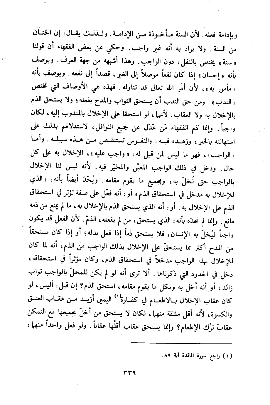 وبإدامة فعله لِأَن السّنة مَأْخُوذَة من الإدامة وَلذَلِك يُقَال إِن الْخِتَان من السّنة وَلَا يُرَاد أَنه غير وَاجِب وَحكي عَن بعض الْفُقَهَاء أَن قَوْلنَا سنة يخْتَص بالنفل دون الْوَاجِب وَهَذَا أشبهه من جِهَة الْعرف ويوصف بِأَنَّهُ إِحْسَان إِذا كَانَ نفعا موصلا إِلَى الْغَيْر قصدا إِلَى نَفعه ويوصف بِأَنَّهُ مَأْمُور بِهِ لِأَن أَمر الله تَعَالَى قد تنَاوله فَهَذِهِ هِيَ الْأَوْصَاف الَّتِي تخْتَص النّدب وَمن حق النّدب أَن يسْتَحق الثَّوَاب والمدح بِفِعْلِهِ وَلَا يسْتَحق الذَّم بالإخلال بِهِ وَلَا الْعقَاب لِأَنَّهُمَا لَو استحقا على الْإِخْلَال بالمندوب إِلَيْهِ لَكَانَ وَاجِبا وَإِنَّمَا ذمّ الْفُقَهَاء من عدل عَن جَمِيع النَّوَافِل لاستدلالهم بذلك على استهانته بالْخبر وزهده فِيهِ والنفوس تستنقص من هَذِه سَبيله وَأما الْوَاجِب فَهُوَ مَا لَيْسَ لمن قيل لَهُ وَاجِب عَلَيْهِ الْإِخْلَال بِهِ على كل حَال وَدخل فِي ذَلِك الْوَاجِب الْمعِين والمخير فِيهِ لِأَنَّهُ لَيْسَ لنا الْإِخْلَال بِالْوَاجِبِ حَتَّى نخل بِهِ وبجميع مَا يقوم مقَامه وَيحد أَيْضا بِأَنَّهُ الَّذِي للإخلال بِهِ مدْخل فِي اسْتِحْقَاق الذَّم أَو أَنه فعل على صفة تُؤثر فِي اسْتِحْقَاق الذَّم على الْإِخْلَال بِهِ أَو أَنه الَّذِي يسْتَحق الذَّم بالإخلال بِهِ مَا لم يمْنَع من ذمه مَانع وَإِنَّمَا لم نحده بِأَنَّهُ الَّذِي يسْتَحق من لم يَفْعَله الذَّم لِأَن الْفِعْل قد يكون وَاجِبا فيخل بِهِ الْإِنْسَان فَلَا يسْتَحق ذما إِذا فعل بدله أَو إِذا كَانَ مُسْتَحقّا من الْمَدْح أَكثر مِمَّا يسْتَحق على الْإِخْلَال بذلك الْوَاجِب من الذَّم أَنه لما كَانَ للإخلال بِهَذَا الْوَاجِب مدخلًا فِي اسْتِحْقَاق الذَّم وَكَانَ مؤثرا فِي اسْتِحْقَاقه دخل فِي الْحُدُود الَّتِي ذَكرنَاهَا أَلا ترى أَنه لَو لم يكن للمخل بِالْوَاجِبِ ثَوَاب زَائِد أَو أَنه أخل بِهِ وَبِكُل مَا يقوم مقَامه اسْتحق الذَّم إِن قيل أَلَيْسَ لَو كَانَ عِقَاب الْإِخْلَال بِالْإِطْعَامِ فِي كَفَّارَة الْيَمين أَزِيد من عِقَاب الْعتْق وَالْكِسْوَة لِأَنَّهُ أقل مشقة مِنْهُمَا لَكَانَ لَا يسْتَحق من أخل بجميعها مَعَ التَّمَكُّن عِقَاب ترك الْإِطْعَام وَإِنَّمَا يسْتَحق عِقَاب أقلهَا عقَابا وَلَو فعل وَاحِدًا مِنْهُمَا