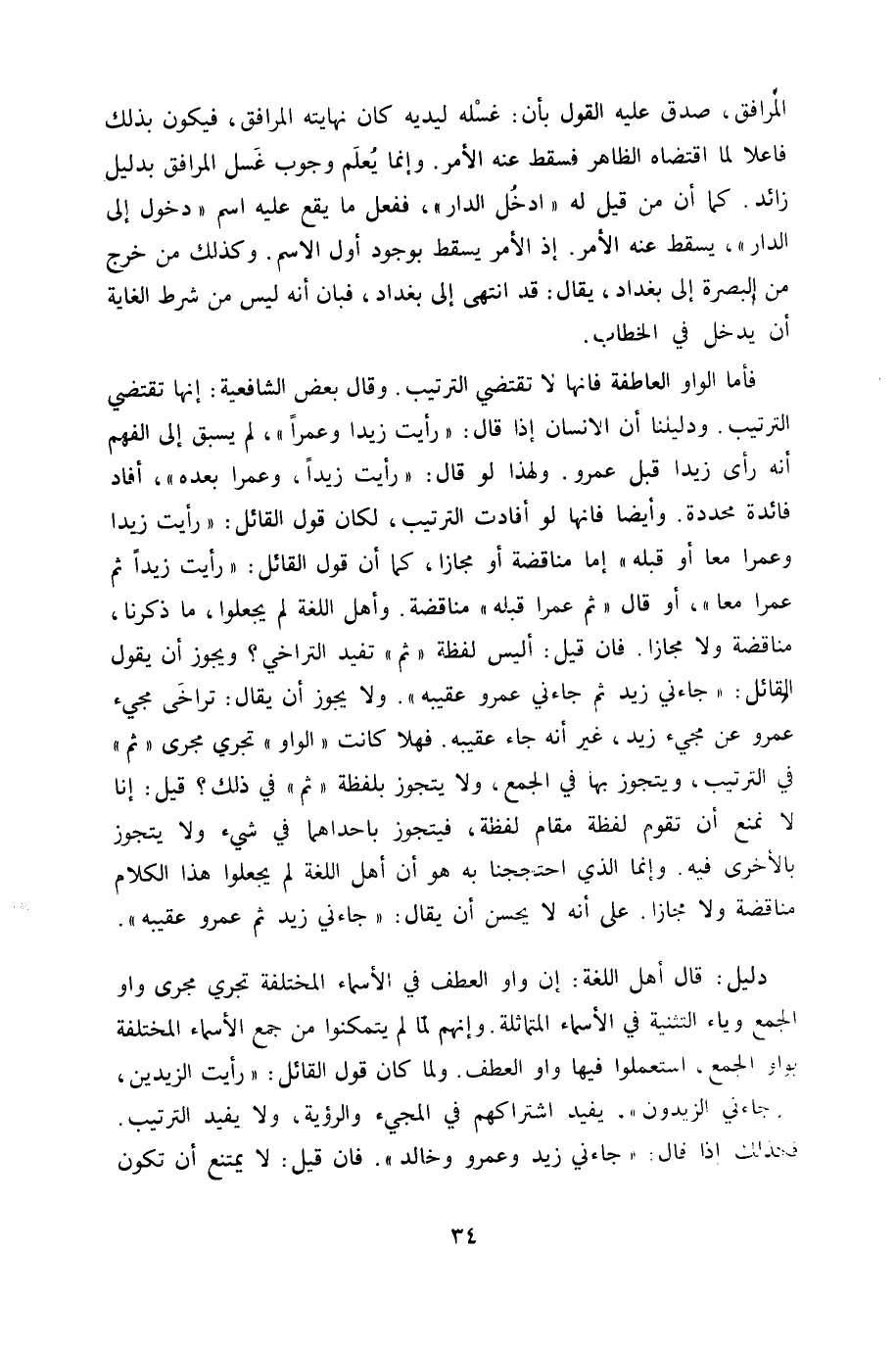 فَأَما الْوَاو العاطفة فَإِنَّهَا لَا تَقْتَضِي التَّرْتِيب وَقَالَ بعض الشَّافِعِيَّة إِنَّهَا تَقْتَضِي التَّرْتِيب وَدَلِيلنَا أَن الْإِنْسَان إِذا قَالَ رَأَيْت زيدا وعمرا لم يسْبق إِلَى الْفَهم أَنه رأى زيدا قبل عَمْرو وَلِهَذَا لَو قَالَ رَأَيْت زيدا وعمرا بعده أَفَادَ فَائِدَة محددة وَأَيْضًا فانها لَو أفادت التَّرْتِيب لَكَانَ قَول الْقَائِل رَأَيْت زيدا وعمرا مَعًا أَو قبله إِمَّا مناقضة أَو مجازاكما أَن قَول الْقَائِل رَأَيْت زيدا ثمَّ عمرا مَعًا أَو قَالَ ثمَّ عمرا قبله مناقضة وَأهل اللُّغَة لم يجْعَلُوا مَا ذكرنَا مناقضة وَلَا مجَازًا فان قيل أَلَيْسَ لَفْظَة ثمَّ تفِيد التَّرَاخِي وَيجوز أَن يَقُول الْقَائِل جَاءَنِي زيد ثمَّ جَاءَنِي عَمْرو عَقِيبه وَلَا يجوز أَن يُقَال ترَاخى مَجِيء عَمْرو عَن مَجِيء زيد غير أَنه جَاءَ عَقِيبه فَهَلا كَانَت الْوَاو تجْرِي مجْرى ثمَّ فِي التَّرْتِيب ويتجوز بهَا فِي الْجمع وَلَا يتجوز بِلَفْظَة ثمَّ فِي ذَلِك قيل إِنَّا لَا نمْنَع أَن تقوم لَفْظَة مقَام لَفْظَة فيتجوز باحداهما فِي شَيْء وَلَا يتجوز بِالْأُخْرَى فِيهِ وَإِنَّمَا الَّذِي احتججنا بِهِ هُوَ أَن أهل اللُّغَة لم يجْعَلُوا هَذَا الْكَلَام مناقضة وَلَا مجَازًا على أَنه لَا يحسن أَن يُقَال جَاءَنِي زيد ثمَّ عَمْرو عَقِيبه