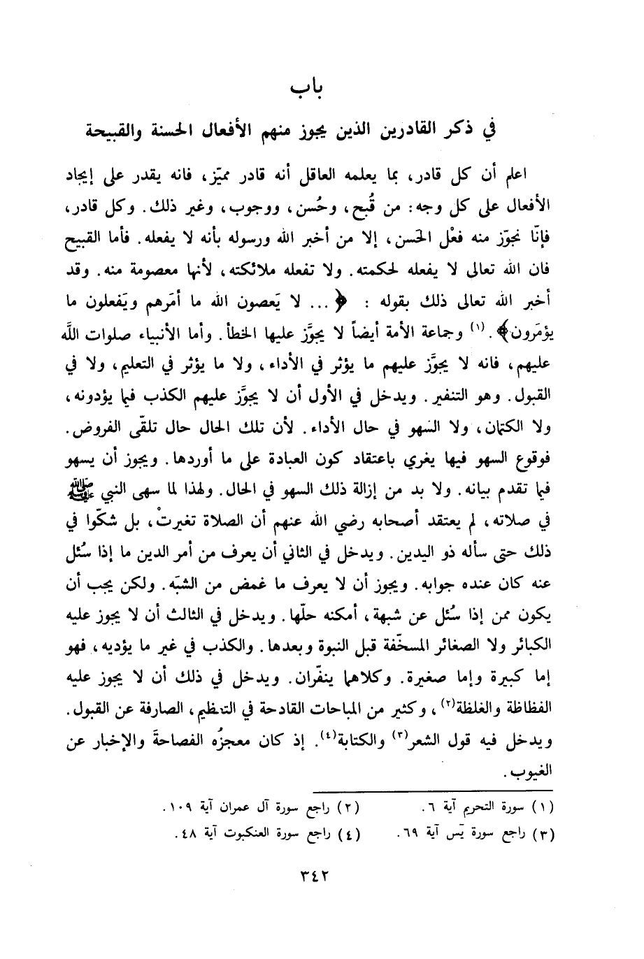اعْلَم أَن كل قَادر بِمَا يُعلمهُ الْعَاقِل أَنه قَادر مُمَيّز فانه يقدر على إِيجَاد الْأَفْعَال على كل وَجه من قبح وَحسن وَوُجُوب وَغير ذَلِك وكل قَادر فَإنَّا نجوز مِنْهُ فعل الْحسن إِلَّا من أخبر الله وَرَسُوله بِأَنَّهُ لَا يَفْعَله فَأَما الْقَبِيح فان الله تَعَالَى لَا يَفْعَله لحكمته وَلَا تَفْعَلهُ مَلَائكَته لِأَنَّهَا معصومة مِنْهُ وَقد أخبر الله تَعَالَى ذَلِك بقوله {لَا يعصون الله مَا أَمرهم ويفعلون مَا يؤمرون} وَجَمَاعَة الْأمة أَيْضا لَا يجوز عَلَيْهَا الْخَطَأ وَأما الْأَنْبِيَاء صلوَات الله عَلَيْهِم فانه لَا يجوز عَلَيْهِم مَا يُؤثر فِي الْأَدَاء وَلَا مَا يُؤثر فِي التَّعْلِيم وَلَا فِي الْقبُول وَهُوَ التنفير وَيدخل فِي الأول أَن لَا يجوز عَلَيْهِم الْكَذِب فِيمَا يؤدونه وَلَا الكتمان وَلَا السَّهْو فِي حَال الْأَدَاء لِأَن تِلْكَ الْحَال حَال تلقى الْفُرُوض فوقوع السَّهْو فِيهَا يغري باعتقاد كَون الْعِبَادَة على مَا أوردهَا وَيجوز أَن يسهو فِيمَا تقدم بَيَانه وَلَا بُد من إِزَالَة ذَلِك السَّهْو فِي الْحَال وَلِهَذَا لما سهى النَّبِي صلى الله عَلَيْهِ وَسلم فِي صلَاته لم يعْتَقد أَصْحَابه رَضِي الله عَنْهُم أَن الصَّلَاة تَغَيَّرت بل شكوا فِي ذَلِك حَتَّى سَأَلَهُ ذُو الْيَدَيْنِ وَيدخل فِي الثَّانِي أَن يعرف من أَمر الدّين مَا إِذا سُئِلَ عَنهُ كَانَ عِنْده جَوَابه وَيجوز أَن لَا يعرف مَا غمض من الشّبَه وَلَكِن يجب أَن يكون مِمَّن إِذا سُئِلَ عَن شُبْهَة أمكنه حلهَا وَيدخل فِي الثَّالِث أَن لَا يجوز عَلَيْهِ الكابئر وَلَا الصَّغَائِر المسخفة قبل النُّبُوَّة وَبعدهَا وَالْكذب فِي عير مَا يُؤَدِّيه فَهُوَ إِمَّا كَبِيرَة وَإِمَّا صَغِيرَة وَكِلَاهُمَا ينفران وَيدخل فِي ذَلِك أَن لَا يجوز عَلَيْهِ الفظاظة والغلظة وَكثير من الْمُبَاحَات القادحة فِي التَّعْظِيم الصارفة عَن الْقبُول وَيدخل فِيهِ قَول الشّعْر وَالْكِتَابَة إِذْ كَانَ معْجزَة الفصاحة والإخبار عَن الغيوب