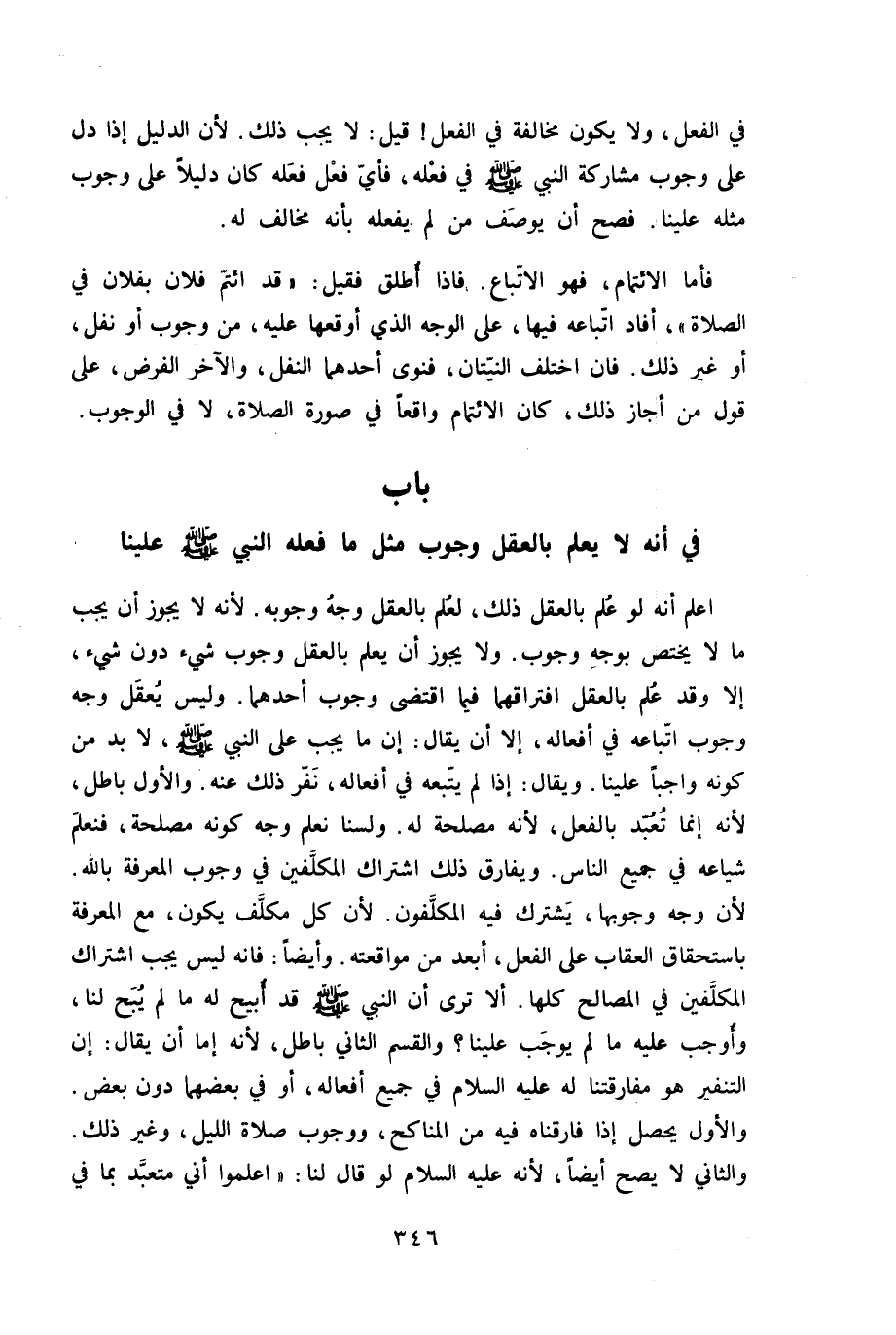 اعْلَم أَنه لَو علم بِالْعقلِ ذَلِك لعلم بِالْعقلِ وَجه وُجُوبه لِأَنَّهُ لَا يجوز أَن يجب مَا لَا يخْتَص بِوَجْه وجوب وَلَا يجوز أَن يعلم بِالْعقلِ وجوب شَيْء دون شَيْء إِلَّا وَقد علم بِالْعقلِ افتراقهما فِيمَا اقتضي وجوب أَحدهمَا وَلَيْسَ يعقل وَجه وجوب اتِّبَاعه فِي أَفعاله إِلَّا أَن يُقَال إِن مَا يجب على النَّبِي صلى الله عَلَيْهِ وَسلم لَا بُد من كَونه وَاجِبا علينا وَيُقَال إِذا لم يتبعهُ فِي أَفعاله نفر ذَلِك عَنهُ وَالْأول بَاطِل لِأَنَّهُ إِنَّمَا تعبد بِالْفِعْلِ لِأَنَّهُ مصلحَة لَهُ ولسنا نعلم وَجه كَونه مصلحَة فنعلم شياعه فِي جَمِيع النَّاس وَيُفَارق ذَلِك اشْتِرَاك الْمُكَلّفين فِي وجوب الْمعرفَة بِاللَّه لِأَن وَجه وجة وَبهَا يشْتَرك فِيهِ المكلفون لِأَن كل مُكَلّف يكون مَعَ الْمعرفَة بِاسْتِحْقَاق الْعقَاب على الْفِعْل أبعد من مواقعته وَأَيْضًا فانه لَيْسَ يجب اشْتِرَاك الْمُكَلّفين فِي الْمصَالح كلهَا أَلا ترى أَن النَّبِي صلى الله عَلَيْهِ وَسلم قد أُبِيح لَهُ مَا لم يبح لنا وَأوجب عَلَيْهِ مَا لم يُوجب علينا وَالْقسم الثَّانِي بَاطِل لِأَنَّهُ إِمَّا أَن يُقَال إِن التنفير هُوَ مفارقتنا لَهُ عَلَيْهِ السَّلَام فِي جَمِيع أَفعاله أَو فِي بعضهما دون بعض وَالْأول يحصل إِذا فارقناه فِيهِ من المناكح وَوُجُوب صَلَاة اللَّيْل وَغير ذَلِك وَالثَّانِي لَا يَصح أَيْضا لِأَنَّهُ عَلَيْهِ السَّلَام لَو قَالَ لنا اعلموا أَنِّي متعبد بِمَا فِي
