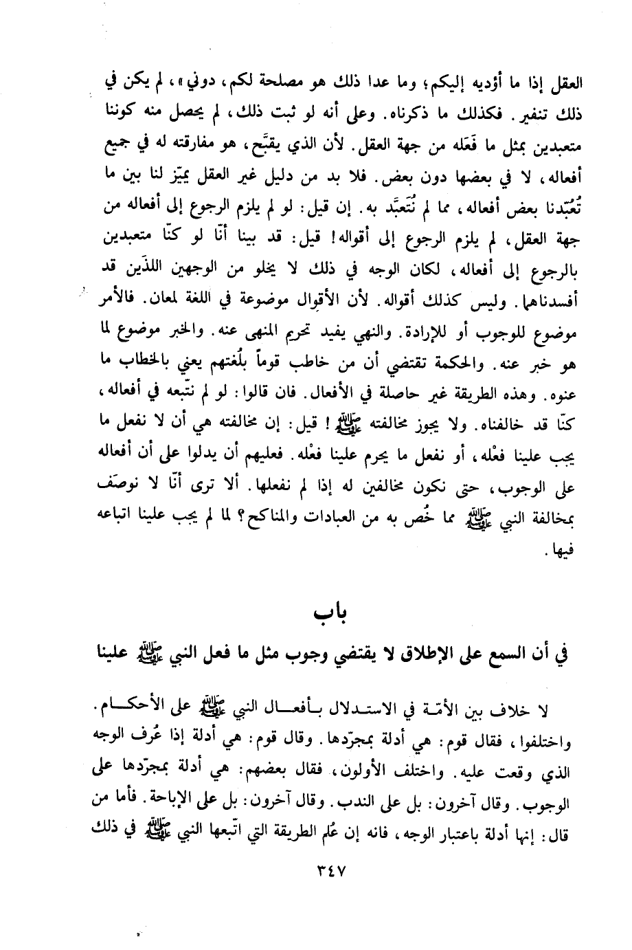 الْعقل إِذا مَا أؤديه إِلَيْكُم وَمَا عدا ذَلِك هُوَ مصلحَة لكم دوني لم يكن فِي ذَلِك تنفير فَكَذَلِك مَا ذَكرْنَاهُ وعَلى أَنه لَو ثَبت ذَلِك لم يحصل مِنْهُ كوننا متعبدين بِمثل مَا فعله من جِهَة الْعقل لِأَن الَّذِي يقبح هُوَ مُفَارقَته لَهُ فِي جَمِيع أَفعاله لَا فِي بَعْضهَا دون بعض فَلَا بُد من دَلِيل غير الْعقل يُمَيّز لنا بَين مَا تعبدنا بعض أَفعاله مِمَّا لم نتعبد بِهِ إِن قيل لَو لم يلْزم الرُّجُوع إِلَى أَفعاله من جِهَة الْعقل لم يلْزم الرُّجُوع إِلَى أَقْوَاله قيل قد بَينا أَنا لَو كُنَّا متعبدين بِالرُّجُوعِ إِلَى أَفعاله لَكَانَ الْوَجْه فِي ذَلِك لَا يَخْلُو من الْوَجْهَيْنِ اللَّذين قد أفسدناهما وَلَيْسَ كَذَلِك أَقْوَاله لِأَن الْأَقْوَال مَوْضُوعَة فِي اللُّغَة لمعان فَالْأَمْر مَوْضُوع للْوُجُوب أَو للإرادة وَالنَّهْي يُفِيد تَحْرِيم المنهى عَنهُ وَالْخَبَر مَوْضُوع لما هُوَ خبر عَنهُ وَالْحكمَة تَقْتَضِي أَن من خَاطب قوما بلغتهم يَعْنِي بِالْخِطَابِ مَا عنوه وَهَذِه الطَّرِيقَة غير حَاصِلَة فِي الْأَفْعَال فان قَالُوا لَو لم نتبعه فِي أَفعاله كُنَّا قد خالفناه وَلَا يجوز مُخَالفَته صلى الله عَلَيْهِ وَسلم قيل إِن مُخَالفَته هِيَ أَن لَا نَفْعل مَا يجب علينا فعله أَو نَفْعل مَا يحرم علينا فعله فَعَلَيْهِم أَن يدلوا على أَن أَفعاله على الْوُجُوب حَتَّى نَكُون مخالفين لَهُ إِذا لم نفعلها أَلا ترى أَنا لَا نوصف بمخالفة النَّبِي صلى الله عَلَيْهِ وَسلم مِمَّا خص بِهِ من الْعِبَادَات والمناكح لما لم يجب علينا اتِّبَاعه فِيهَا - صَلَّى اللَّهُ عَلَيْهِ وَسَلَّم َ - بَاب فِي أَن السّمع على الْإِطْلَاق لَا يَقْتَضِي وجوب مثل مَا فعل النَّبِي صلى الله عَلَيْهِ وَسلم علينا - صَلَّى اللَّهُ عَلَيْهِ وَسَلَّم َ -
