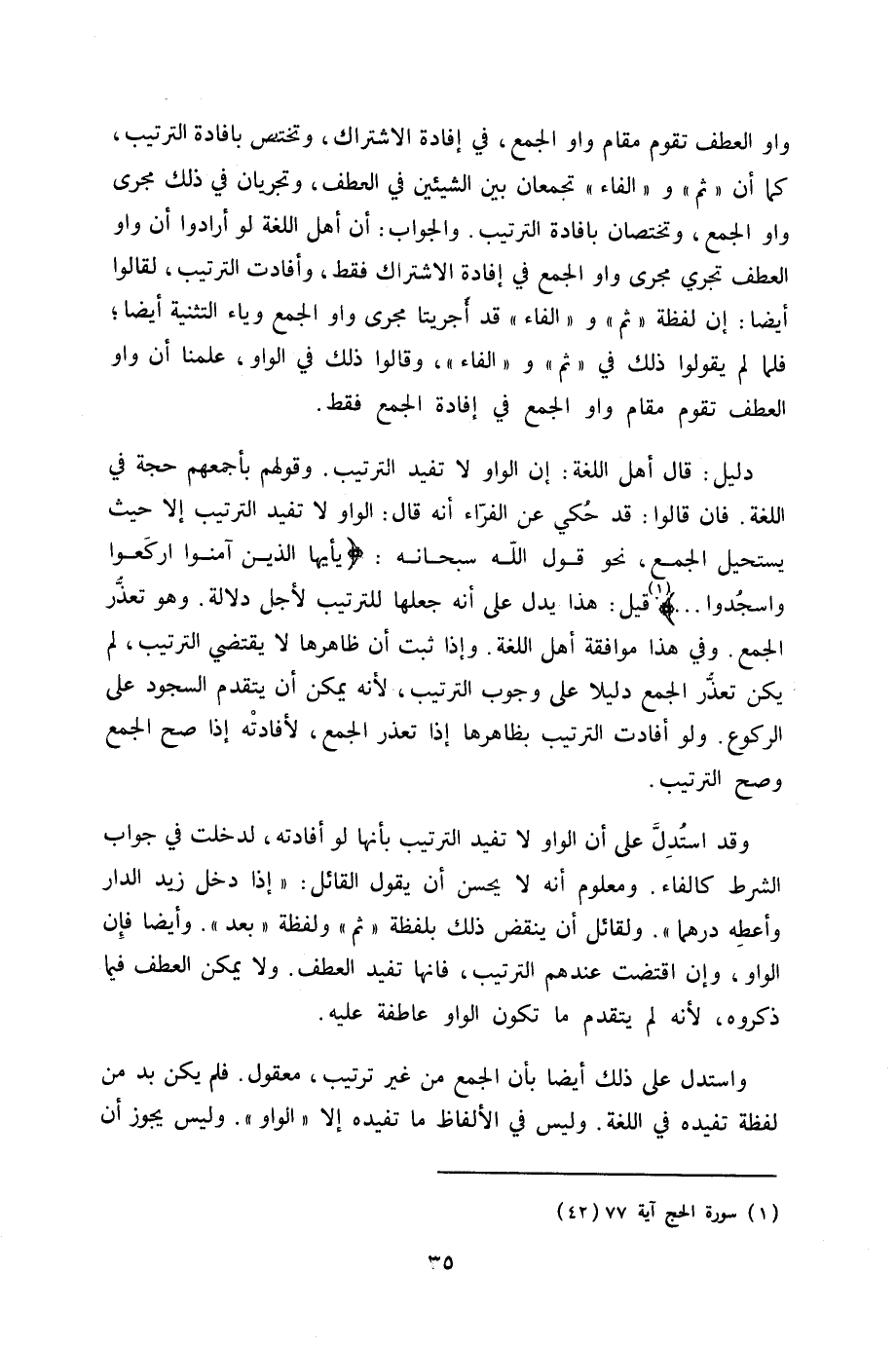 وَاو الْعَطف تقوم مقَام وَاو الْجمع فِي إِفَادَة الِاشْتِرَاك وتختص بافادة التَّرْتِيب كَمَا أَن ثمَّ وَالْفَاء تجمعان بَين الشَّيْئَيْنِ فِي الْعَطف وتجريان فِي ذَلِك مجْرى وَاو الْجمع وتختصان بافادة التَّرْتِيب وَالْجَوَاب أَن أهل اللُّغَة لَو أَرَادوا أَن وَاو الْعَطف تجْرِي مجْرى وَاو الْجمع فِي إِفَادَة الِاشْتِرَاك فَقَط وأفادت التَّرْتِيب لقالوا أَيْضا إِن لَفْظَة ثمَّ وَالْفَاء قد أجريتا مجْرى وَاو الْجمع وياء التَّثْنِيَة أَيْضا فَلَمَّا لم يَقُولُوا ذَلِك فِي ثمَّ وَالْفَاء وَقَالُوا ذَلِك فِي الْوَاو علمنَا أَن وَاو الْعَطف تقوم مقَام وَاو الْجمع فِي إِفَادَة الْجمع فَقَط