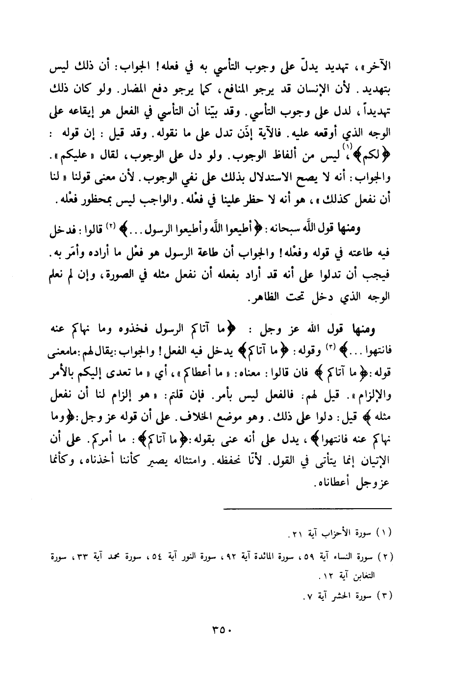 وَمِنْهَا قَول الله عز وَجل {وَمَا آتَاكُم الرَّسُول فَخُذُوهُ وَمَا نهاكم عَنهُ فَانْتَهوا} وَقَوله {مَا آتَاكُم} يدْخل فِيهِ الْفِعْل وَالْجَوَاب يُقَال لَهُم مَا معنى قَوْله {مَا آتَاكُم} فان قَالُوا مَعْنَاهُ مَا أَعْطَاكُم أَي مَا تعدى إِلَيْكُم بِالْأَمر والإلزام قيل لَهُم فالفعل لَيْسَ بِأَمْر فان قُلْتُمْ هُوَ إِلْزَام لنا أَن نَفْعل مثله قيل دلوا على ذَلِك وَهُوَ مَوضِع الْخلاف على أَن قَوْله عز وَجل {وَمَا نهاكم عَنهُ فَانْتَهوا} يدل على أَنه عَنى بقوله {مَا آتَاكُم} مَا أَمركُم على أَن الْإِتْيَان إِنَّمَا يَتَأَتَّى فِي القَوْل لأَنا نَحْفَظهُ وامتثاله يصير كأننا أخذناه وكأنما عز وَجل أعطاناه