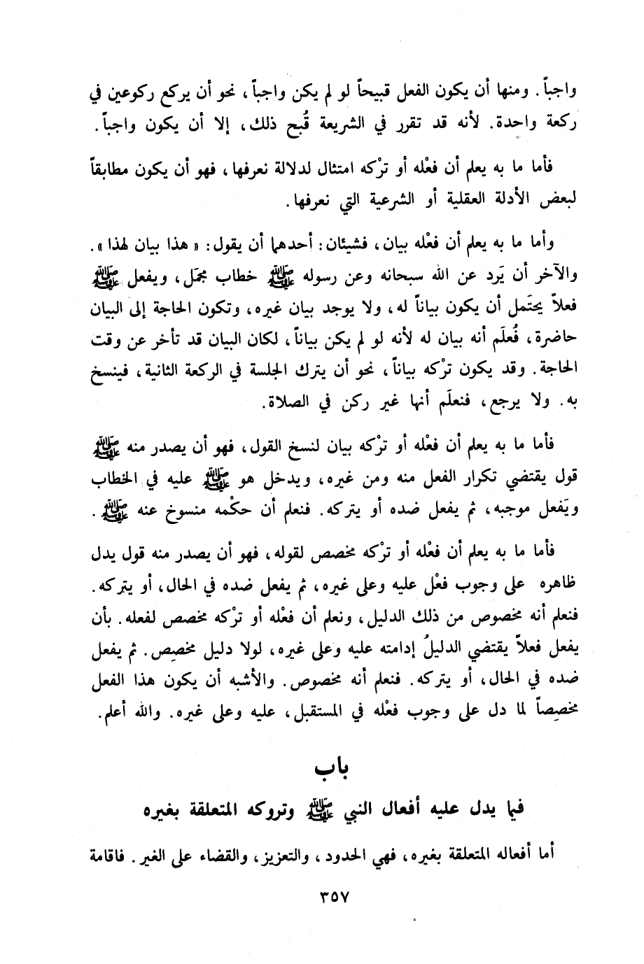فَأَما مَا بِهِ يعلم أَن فعله أَو تَركه مُخَصص لقَوْله فَهُوَ أَن يصدر مِنْهُ قَول يدل ظَاهره على وجوب فعل عَلَيْهِ وعَلى غَيره ثمَّ يفعل ضِدّه فِي الْحَال أَو يتْركهُ فنعلم أَنه مَخْصُوص من ذَلِك الدَّلِيل ونعلم أَن فعله أَو تَركه مُخَصص لفعله بِأَن يفعل فعلا يَقْتَضِي الدَّلِيل إدامته عَلَيْهِ وعَلى غَيره لَوْلَا دَلِيل مُخَصص ثمَّ يفعل ضِدّه فِي الْحَال أَو يتْركهُ فنعلم انه مَخْصُوص وَالْأَشْبَه أَن يكون هَذَا الْفِعْل مُخَصّصا لما دلّ على وجوب فعله فِي الْمُسْتَقْبل عَلَيْهِ وعَلى غَيره وَالله أعلم - صَلَّى اللَّهُ عَلَيْهِ وَسَلَّم َ - بَاب فِيمَا يدل عَلَيْهِ أَفعَال النَّبِي صلى الله عَلَيْهِ وَسلم وتروكه الْمُتَعَلّقَة بِغَيْرِهِ - صَلَّى اللَّهُ عَلَيْهِ وَسَلَّم َ -