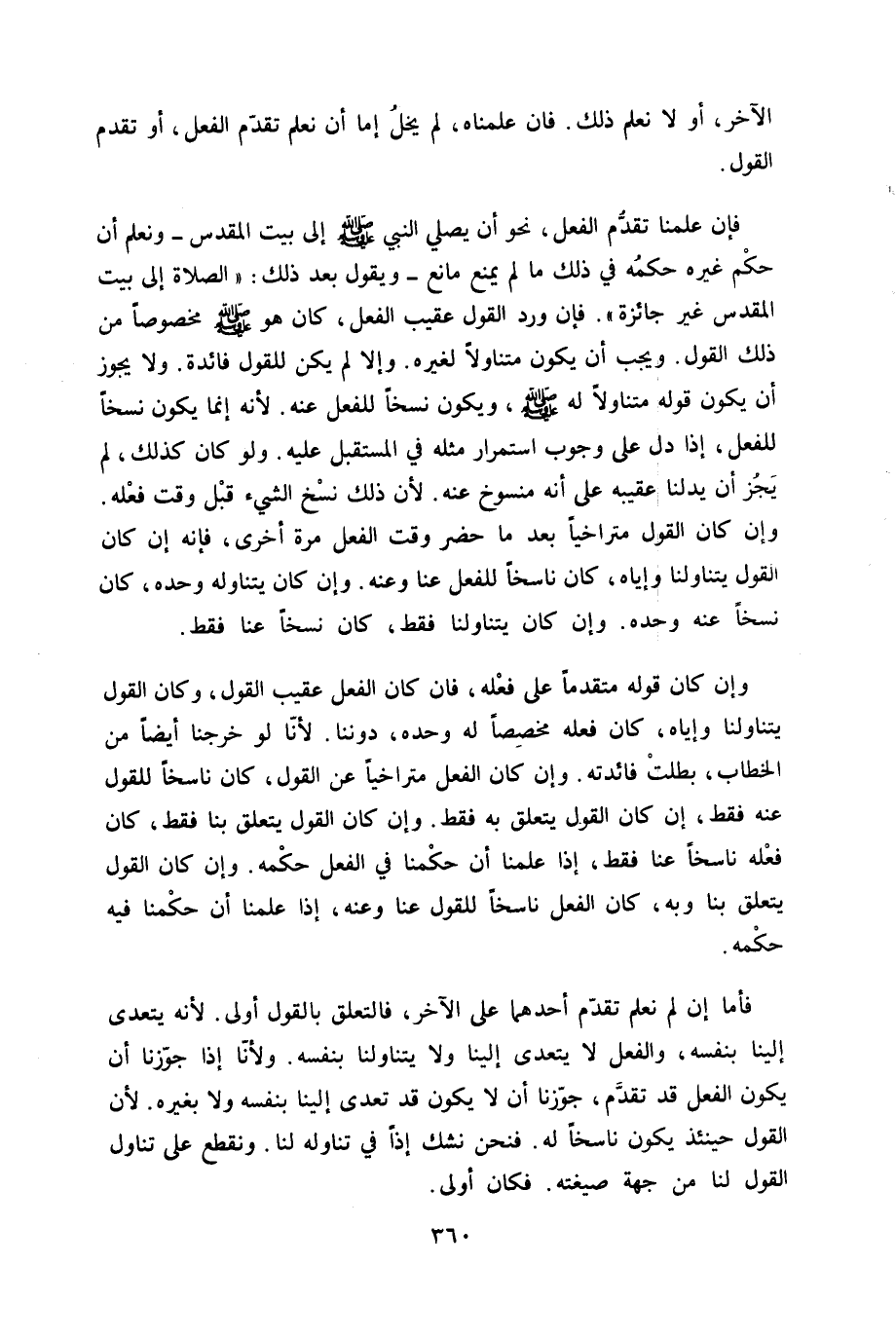 فَإِن علمنَا تقدم الْفِعْل نَحْو أَن يُصَلِّي النَّبِي صلى الله عَلَيْهِ وَسلم إِلَى بَيت الْمُقَدّس ونعلم أَن حكم غَيره حكمه فِي ذَلِك مَا لم يمْنَع مَانع وَيَقُول بعد ذَلِك الصَّلَاة إِلَى بَيت الْمُقَدّس غير جَائِزَة فَإِن ورد القَوْل عقيب الْفِعْل كَانَ هُوَ صلى الله عَلَيْهِ وَسلم مَخْصُوصًا من ذَلِك القَوْل وَيجب أَن يكون متناوله لغيره وَإِلَّا لم يكن لِلْقَوْلِ فَائِدَة وَلَا يجوز أَن يكون قَوْله متناولا لَهُ صلى الله عَلَيْهِ وَسلم وَيكون نسخا للْفِعْل عَنهُ لِأَنَّهُ إِنَّمَا يكون نسخا للْفِعْل إِذا دلّ على وجوب اسْتِمْرَار مثله فِي الْمُسْتَقْبل عَلَيْهِ وَلَو كَانَ كَذَلِك لم يجز أَن يدلنا عَقِيبه على أَنه مَنْسُوخ عَنهُ لِأَن ذَلِك نسخ الشَّيْء قبل وَقت فعله وَإِن كَانَ القَوْل متراخيا بعد مَا حضر وَقت الْفِعْل مرّة أُخْرَى فَإِنَّهُ إِن كَانَ القَوْل يتناولنا وإياه كَانَ نَاسِخا للْفِعْل عَنَّا وَعنهُ وَإِن كَانَ يتَنَاوَلهُ وَحده كَانَ نسخا عَنهُ وَحده وَإِن كَانَ يتناولنا فقد كَانَ نسخا عَنَّا فَقَط