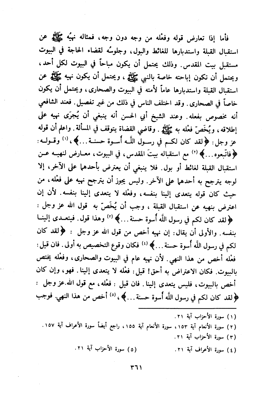 فَأَما إِذا تعَارض قَوْله وَفعله من وَجه دون وَجه فمثاله نَهْيه صلى الله عَلَيْهِ وَسلم عَن اسْتِقْبَال الْقبْلَة واستدبارها للغائط وَالْبَوْل وجلوسه لقَضَاء الْحَاجة فِي الْبيُوت مُسْتَقْبل بَيت الْمُقَدّس وَذَلِكَ يحْتَمل أَن يكون مُبَاحا فِي الْبيُوت لكل أحد وَيحْتَمل أَن تكون إِبَاحَته خَاصَّة بِالنَّبِيِّ صلى الله عَلَيْهِ وَسلم وَيحْتَمل أَن يكون نَهْيه صلى الله عَلَيْهِ وَسلم عَن اسْتِقْبَال الْقبْلَة واستدبارها عَاما لأمته فِي الْبيُوت والصحارى وَيحْتَمل أَن يكون خَاصّا فِي الصحارى وَقد اخْتلف النَّاس فِي ذَلِك من غير تَفْصِيل فَعِنْدَ الشَّافِعِي أَنه مَخْصُوص بِفِعْلِهِ وَعند الشَّيْخ أبي الْحسن أَنه يَنْبَغِي أَن يجرى نَهْيه على إِطْلَاقه ويخص فعله بِهِ صلى الله عَلَيْهِ وَسلم وقاضي الْقُضَاة يتَوَقَّف فِي الْمَسْأَلَة وَاعْلَم أَن قَوْله عز وَجل {لقد كَانَ لكم فِي رَسُول الله أُسْوَة حَسَنَة} وَقَوله {فَاتَّبعُوهُ} مَعَ استقباله بَيت الْمُقَدّس فِي الْبيُوت معَارض لنَهْيه عَن اسْتِقْبَال الْقبْلَة لغائط أَو بَوْل فَلَا يَنْبَغِي أَن يعْتَرض بِأَحَدِهِمَا على الآخر إِلَّا لوجه يتَرَجَّح بِهِ أَحدهمَا على الآخر وَلَيْسَ يجوز أَن يتَرَجَّح نَهْيه على فعله من حَيْثُ كَانَ قَوْله يتَعَدَّى إِلَيْنَا بِنَفسِهِ وَفعله لَا يتَعَدَّى إِلَيْنَا بِنَفسِهِ لِأَن إِن اعْترض بنهيه عَن اسْتِقْبَال الْقبْلَة وَجب أَن يخص بِهِ قَول الله عز وَجل {لقد كَانَ لكم فِي رَسُول الله أُسْوَة حَسَنَة} وَهَذَا قَول فيتعدى إِلَيْنَا بِنَفسِهِ وَالْأولَى أَن يُقَال إِن نَهْيه أخص من قَول الله عز وَجل {لقد كَانَ لكم فِي رَسُول الله أُسْوَة حَسَنَة} فَكَانَ وُقُوع التَّخْصِيص بِهِ أولى فان قيل فعله أخص من هَذَا النَّهْي لِأَن نَهْيه عَام فِي الْبيُوت والصحارى وَفعله يخْتَص بِالْبُيُوتِ فَكَانَ الِاعْتِرَاض بِهِ أَحَق قيل فعله لَا يتَعَدَّى إِلَيْنَا فَهُوَ وَإِن كَانَ أخص بِالْبُيُوتِ فَلَيْسَ يتَعَدَّى إِلَيْنَا فان قيل فعله مَعَ قَول الله عز وَجل {لقد كَانَ لكم فِي رَسُول الله أُسْوَة حَسَنَة} أخص من هَذَا النَّهْي فَوَجَبَ