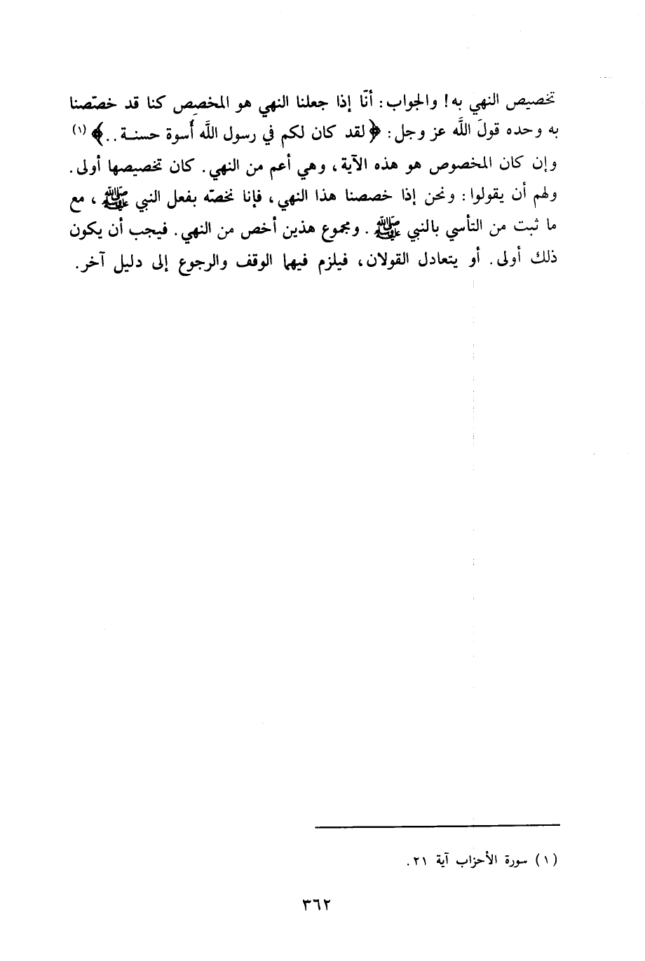 تَخْصِيص النَّهْي بِهِ وَالْجَوَاب أَنا إِذا جعلنَا النَّهْي هُوَ الْمُخَصّص كُنَّا قد خصصنا بِهِ وَحده قَول الله عز وَجل {لقد كَانَ لكم فِي رَسُول الله أُسْوَة حَسَنَة} وَإِن كَانَ الْمَخْصُوص هُوَ هَذِه الْآيَة وَهِي أَعم من النَّهْي كَانَ تخصيصها أولى وَلَهُم أَن يَقُولُوا وَنحن إِذا خصصنا هَذَا النَّهْي فَإنَّا نخصه بِفعل النَّبِي صلى الله عَلَيْهِ وَسلم مَعَ مَا ثَبت من التأسي بِالنَّبِيِّ صلى الله عَلَيْهِ وَسلم ومجموع هذَيْن أخص من النَّهْي فَيجب أَن يكون ذَلِك أولى أَو يتعادل الْقَوْلَانِ فَيلْزم فيهمَا الْوَقْف وَالرُّجُوع إِلَى دَلِيل آخر