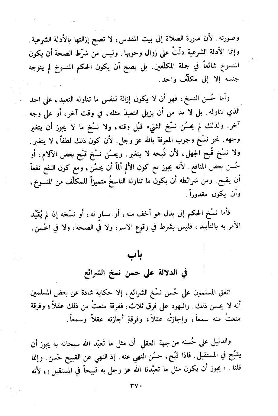 فَأَما نسخ الحكم إِلَى بدل هُوَ أخف مِنْهُ أَو مسَاوٍ لَهُ أَو نسخه إِذا لم يُقيد الْأَمر بِهِ بالتأبيد فَلَيْسَ بِشَرْط فِي وُقُوع الِاسْم وَلَا فِي الصِّحَّة وَلَا فِي الْحسن - صَلَّى اللَّهُ عَلَيْهِ وَسَلَّم َ - بَاب فِي الدّلَالَة على حسن نسخ الشَّرَائِع - صَلَّى اللَّهُ عَلَيْهِ وَسَلَّم َ -