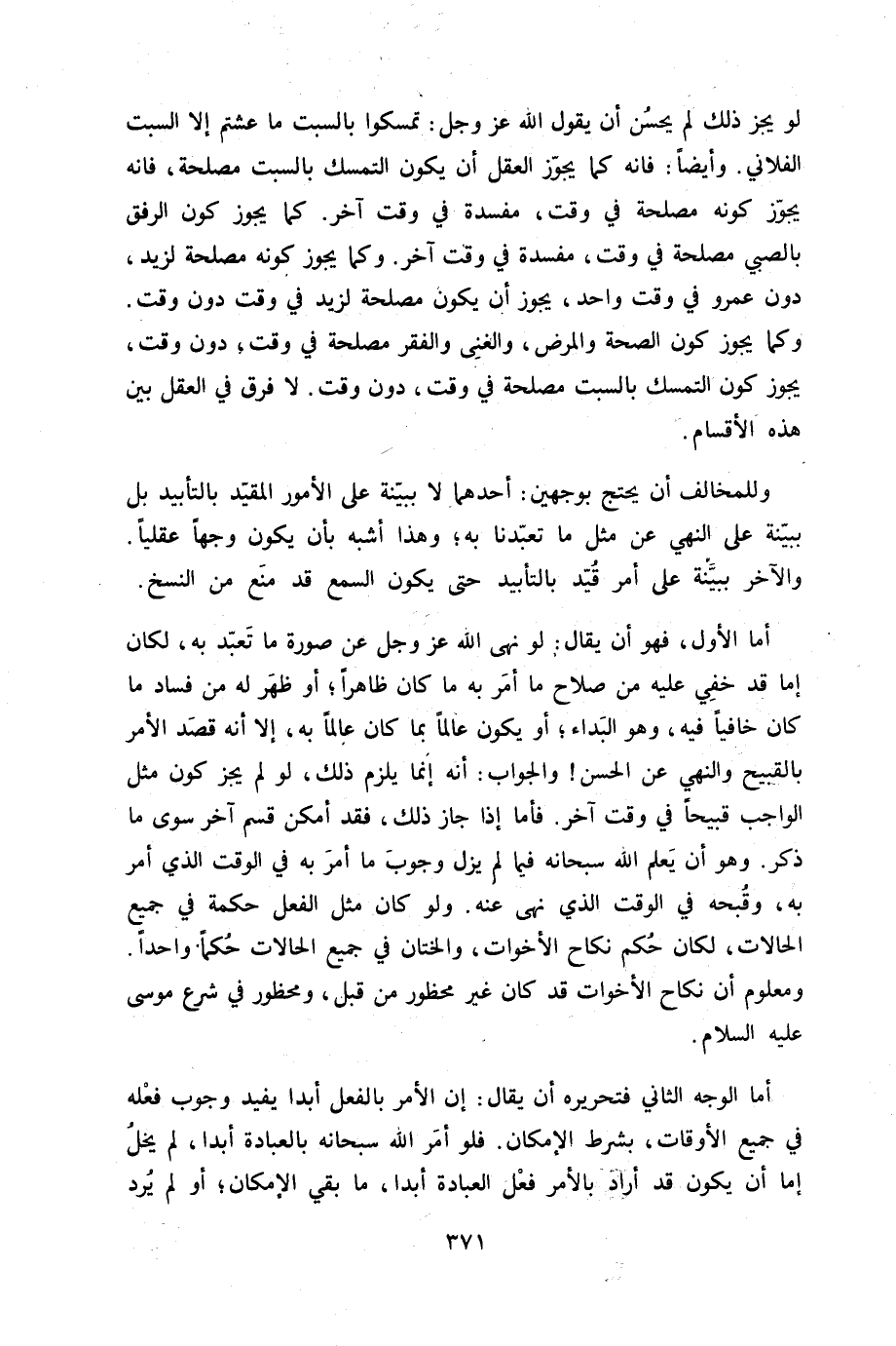 لَو يجز ذَلِك لم يحسن أَن يَقُول الله عز وَجل تمسكوا بالسبت مَا عشتم إِلَّا السبت الْفُلَانِيّ وَأَيْضًا فانه كَمَا يجوز الْعقل أَن يكون التَّمَسُّك بالسبت مصلحَة فانه يجوز كَونه مصلحَة فِي وَقت مفْسدَة فِي وَقت آخر كَمَا يجوز كَون الرِّفْق بِالصَّبِيِّ مصلحَة فِي وَقت مفْسدَة فِي وَقت آخر وكما يجوز كَونه مصلحَة لزيد دون عَمْرو فِي وَقت وَاحِد يجوز أَن يكون مصلحَة لزيد فِي وَقت دون وَقت وكما يجوز كَون الصِّحَّة وَالْمَرَض والغنى والفقر مصلحَة فِي وَقت دون وَقت يجوز كَون التَّمَسُّك بالسبت مصلحَة فِي وَقت دون وَقت لَا فرق فِي الْعقل بَين هَذِه الْأَقْسَام