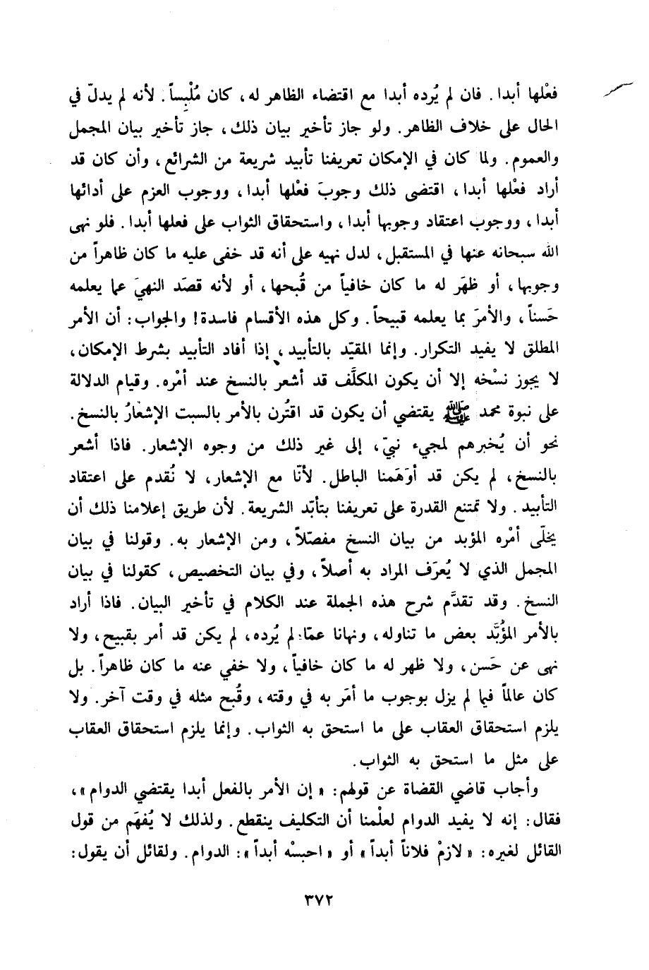 فعلهَا أبدا فان لم يردهُ أبدا مَعَ اقْتِضَاء الظَّاهِر لَهُ كَانَ ملبسا لِأَنَّهُ لم يدل فِي الْحَال على خلاف الظَّاهِر وَلَو جَازَ تَأْخِير بَيَان ذَلِك جَازَ تَأْخِير بَيَان الْمُجْمل والعموم وَلما كَانَ فِي الْإِمْكَان تعريفنا تأبيد شَرِيعَة من الشَّرَائِع وَأَن كَانَ قد أَرَادَ فعلهَا أبدا اقْتضى ذَلِك وجوب فعلهَا أبدا وَوُجُوب الْعَزْم على أَدَائِهَا أبدا وَوُجُوب اعْتِقَاد وُجُوبهَا أبدا وَاسْتِحْقَاق الثَّوَاب على فعلهَا أبدا فَلَو نهى الله سُبْحَانَهُ عَنْهَا فِي الْمُسْتَقْبل لدل نَهْيه على أَنه قد خَفِي عَلَيْهِ مَا كَانَ ظَاهرا من وُجُوبهَا أَو ظهر لَهُ مَا كَانَ خافيا من قبحها أَو لِأَنَّهُ قصد النَّهْي عَمَّا يُعلمهُ حسنا وَالْأَمر بِمَا يُعلمهُ قبيحا وكل هَذِه الْأَقْسَام فَاسِدَة وَالْجَوَاب أَن الْأَمر الْمُطلق لَا يُفِيد التّكْرَار وَإِنَّمَا الْمُقَيد بالتأبيد إِذا أَفَادَ التَّأْبِيد بِشَرْط الْإِمْكَان لَا يجوز نسخه إِلَّا أَن يكون الْمُكَلف قد أشعر بالنسخ عِنْد أمره وَقيام الدّلَالَة على نبوة مُحَمَّد صلى الله عَلَيْهِ وَسلم يَقْتَضِي أَن يكون قد اقْترن بِالْأَمر بالسبت الْإِشْعَار بالنسخ نَحْو أَن يُخْبِرهُمْ لمجيء نَبِي إِلَى غير ذَلِك من وُجُوه الْإِشْعَار فاذا أشعر بالنسخ لم يكن قد أوهمنا الْبَاطِل لأَنا مَعَ الْإِشْعَار لَا نقدم على اعْتِقَاد التَّأْبِيد وَلَا تمْتَنع الْقُدْرَة على تعريفنا بتأبيد الشَّرِيعَة لِأَن طَرِيق إعلامنا ذَلِك أَن يخلى أمره المؤبد من بَيَان النّسخ مفصلا وَمن الْإِشْعَار بِهِ وَقَوْلنَا فِي بَيَان الْمُجْمل الَّذِي لَا يعرف المُرَاد بِهِ أصلا وَفِي بَيَان التَّخْصِيص كَقَوْلِنَا فِي بَيَان النّسخ وَقد تقدم شرح هَذِه الْجُمْلَة عِنْد الْكَلَام فِي تَأْخِير الْبَيَان فاذا أَرَادَ بِالْأَمر المؤبد بعض مَا تنَاوله ونهانا عَمَّا لم يردهُ لم يكن قد أَمر بقبيح وَلَا نهى عَن حسن وَلَا ظهر لَهُ مَا كَانَ خافيا وَلَا خَفِي عَنهُ مَا كَانَ ظَاهرا بل كَانَ عَالما فِيمَا لم يزل بِوُجُوب مَا أَمر بِهِ فِي وقته وقبح مثله فِي وَقت آخر وَلَا يلْزم اسْتِحْقَاق الْعقَاب على مَا اسْتحق بِهِ الثَّوَاب وَإِنَّمَا يلْزم اسْتِحْقَاق الْعقَاب على مثل مَا اسْتحق بِهِ الثَّوَاب