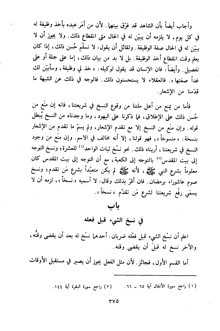 اعْلَم أَن نسخ الشَّيْء قبل فعله ضَرْبَان أَحدهمَا نسخ لَهُ بعد أَن يقْضى وقته وَالْآخر نسخ لَهُ قبل أَن يقْضى وقته