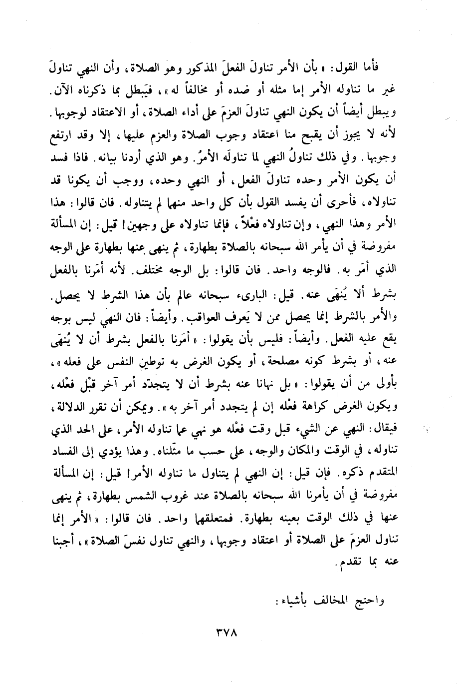 فَأَما القَوْل بِأَن الْأَمر تنَاول الْفِعْل الْمَذْكُور وَهُوَ الصَّلَاة وَأَن النَّهْي تنَاول غير مَا تنَاوله الْأَمر إِمَّا مثله أَو ضِدّه أَو مُخَالفا لَهُ فَيبْطل بِمَا ذَكرْنَاهُ الْآن وَيبْطل أَيْضا أَن يكون النَّهْي تنَاول الْعَزْم على أَدَاء الصَّلَاة أَو الِاعْتِقَاد لوُجُوبهَا لِأَنَّهُ لَا يجوز أَن يقبح منا اعْتِقَاد وجوب الصَّلَاة والعزم عَلَيْهَا إِلَّا وَقد ارْتَفع وُجُوبهَا وَفِي ذَلِك تنَاول النَّهْي لما تنَاوله الْأَمر وَهُوَ الَّذِي أردنَا بَيَانه فاذا فسد أَن يكون الْأَمر وَحده تنَاول الْفِعْل أَو النَّهْي وَحده وَوَجَب أَن يَكُونَا قد تناولاه فأحرى أَن يفْسد القَوْل بِأَن كل وَاحِد مِنْهُمَا لم يتَنَاوَلهُ فان قَالُوا هَذَا الْأَمر وَهَذَا النَّهْي وَإِن تناولاه فعلا فَإِنَّمَا تناولاه على وَجْهَيْن قيل إِن الْمَسْأَلَة مَفْرُوضَة فِي أَن يَأْمر الله سُبْحَانَهُ بِالصَّلَاةِ بِطَهَارَة ثمَّ ينْهَى عَنْهَا بِطَهَارَة على الْوَجْه الَّذِي أَمر بِهِ فَالْوَجْه وَاحِد فان قَالُوا بل الْوَجْه مُخْتَلف لِأَنَّهُ أمرنَا بِالْفِعْلِ بِشَرْط أَلا ينْهَى عَنهُ قيل البارىء سُبْحَانَهُ عَالم بِأَن هَذَا الشَّرْط لَا يحصل وَالْأَمر بِالشّرطِ إِنَّمَا يحصل مِمَّن لَا يعرف العواقب وَأَيْضًا فان النَّهْي لَيْسَ بِوَجْه يَقع عَلَيْهِ الْفِعْل وَأَيْضًا فَلَيْسَ بِأَن يَقُولُوا أمرنَا بِالْفِعْلِ بِشَرْط أَن لَا ينْهَى عَنهُ أَو بِشَرْط كَونه مصلحَة أَو يكون الْغَرَض بِهِ توطين النَّفس على فعله بِأولى من أَن يَقُولُوا بل نَهَانَا عَنهُ بِشَرْط أَن لَا يَتَجَدَّد أَمر آخر قبل فعله وَيكون الْغَرَض كَرَاهَة فعله إِن لم يَتَجَدَّد أَمر آخر بِهِ وَيُمكن أَن تقرر الدّلَالَة فَيُقَال النَّهْي عَن الشَّيْء قبل وَقت فعله هُوَ نهي عَمَّا تنَاوله الْأَمر على الْحَد الَّذِي تنَاوله فِي الْوَقْت وَالْمَكَان وَالْوَجْه على حسب مَا مثلناه وَهَذَا يُؤَدِّي إِلَى الْفساد الْمُتَقَدّم ذكره فَإِن قيل إِن النَّهْي لم يتَنَاوَل مَا تنَاوله الْأَمر قيل إِن الْمَسْأَلَة مَفْرُوضَة فِي أَن يَأْمُرنَا الله سُبْحَانَهُ بِالصَّلَاةِ عِنْد غرُوب الشَّمْس بِطَهَارَة ثمَّ ينْهَى عَنْهَا فِي ذَلِك الْوَقْت بِعَيْنِه بِطَهَارَة فمتعلقهما وَاحِد فان قَالُوا الْأَمر إِنَّمَا تنَاول الْعَزْم على الصَّلَاة أَو اعْتِقَاد وُجُوبهَا وَالنَّهْي تنَاول نفس الصَّلَاة أجبنا عَنهُ بِمَا تقدم