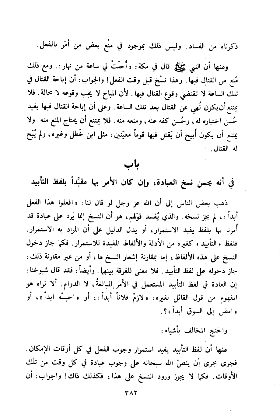 ذهب بعض النَّاس إِلَى أَن الله عز وَجل لَو قَالَ لنا افعلوا هَذَا الْفِعْل أبدا لم يجز نسخه وَالَّذِي يفْسد قَوْلهم هُوَ أَن النّسخ إِنَّمَا يرد على عبَادَة قد أمرنَا بهَا بِلَفْظ يُفِيد الِاسْتِمْرَار أَو يدل الدَّلِيل على أَن المُرَاد بِهِ الِاسْتِمْرَار فَلفظ التَّأْبِيد كَغَيْرِهِ من الْأَدِلَّة والألفاظ المفيدة للاستمرار فَكَمَا جَازَ دُخُول النّسخ على هَذِه الْأَلْفَاظ إِمَّا بمقارنة إِشْعَار النّسخ لَهَا أَو من غير مُقَارنَة ذَلِك جَازَ دُخُوله على لفظ التَّأْبِيد فَلَا معنى للفرقة بَينهمَا وَأَيْضًا فقد قَالَ شُيُوخنَا إِن الْعَادة فِي لفظ التَّأْبِيد الْمُسْتَعْمل فِي الْأَمر الْمُبَالغَة لَا الدَّوَام أَلا ترَاهُ هُوَ الْمَفْهُوم من قَول الْقَائِل لغيره لَازم فلَانا أبدا أَو احبسه أبدا أَو امْضِ إِلَى السُّوق أبدا