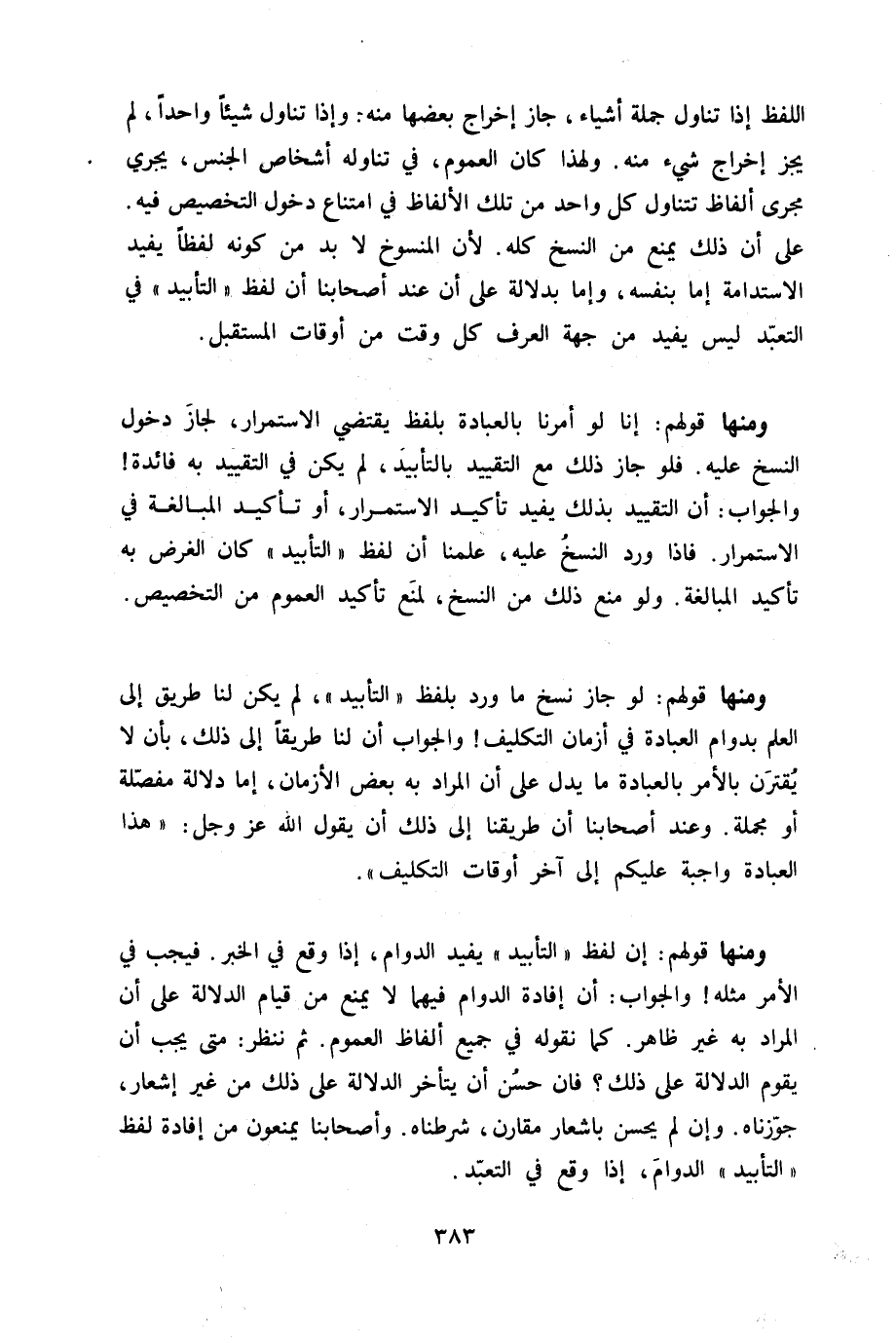 وَمِنْهَا قَوْلهم إِن لفظ التَّأْبِيد يُفِيد الدَّوَام إِذا وَقع فِي الْخَبَر فَيجب فِي الْأَمر مثله وَالْجَوَاب أَن إِفَادَة الدَّوَام فيهمَا لَا يمْنَع من قيام الدّلَالَة على أَن المُرَاد بِهِ غير ظَاهر كَمَا نقُوله فِي جَمِيع أَلْفَاظ الْعُمُوم ثمَّ نَنْظُر مَتى يجب أَن يقوم الدّلَالَة على ذَلِك فان حسن أَن يتَأَخَّر الدّلَالَة على ذَلِك من غير إِشْعَار جوزناه وَإِن لم يحسن باشعار مُقَارن شرطناه وأصحابنا يمْنَعُونَ من إِفَادَة لفظ التَّأْبِيد الدَّوَام إِذا وَقع فِي التَّعَبُّد