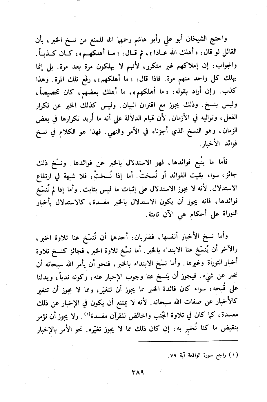 وَاحْتج الشَّيْخَانِ أَبُو عَليّ وَأَبُو هَاشم رحمهمَا الله للْمَنْع من نسخ الْخَبَر بِأَن الْقَائِل لَو قَالَ أهلك الله عادا ثمَّ قَالَ مَا أهلكهم كَانَ كذبا وَالْجَوَاب إِن إملاكهم غير متكرر لأَنهم لَا يهْلكُونَ مرّة بعد مرّة بل إِنَّمَا يهْلك كل وَاحِد مِنْهُم مرّة فاذا قَالَ مَا أهلكهم رفع تِلْكَ الْمرة وَهَذَا كذب وَإِن أَرَادَ بقوله مَا أهلكهم مَا أهلك بَعضهم كَانَ تَخْصِيصًا وَلَيْسَ بنسخ وَذَلِكَ يجوز مَعَ اقتران الْبَيَان وَلَيْسَ كَذَلِك الْخَبَر عَن تكْرَار الْفِعْل وتواليه فِي الْأَزْمَان لِأَن قيام الدّلَالَة على أَنه مَا أُرِيد تكرارها فِي بعض الزَّمَان وَهُوَ النّسخ الَّذِي أجزناه فِي الْأَمر وَالنَّهْي فَهَذَا هُوَ الْكَلَام فِي نسخ فَوَائِد الْأَخْبَار