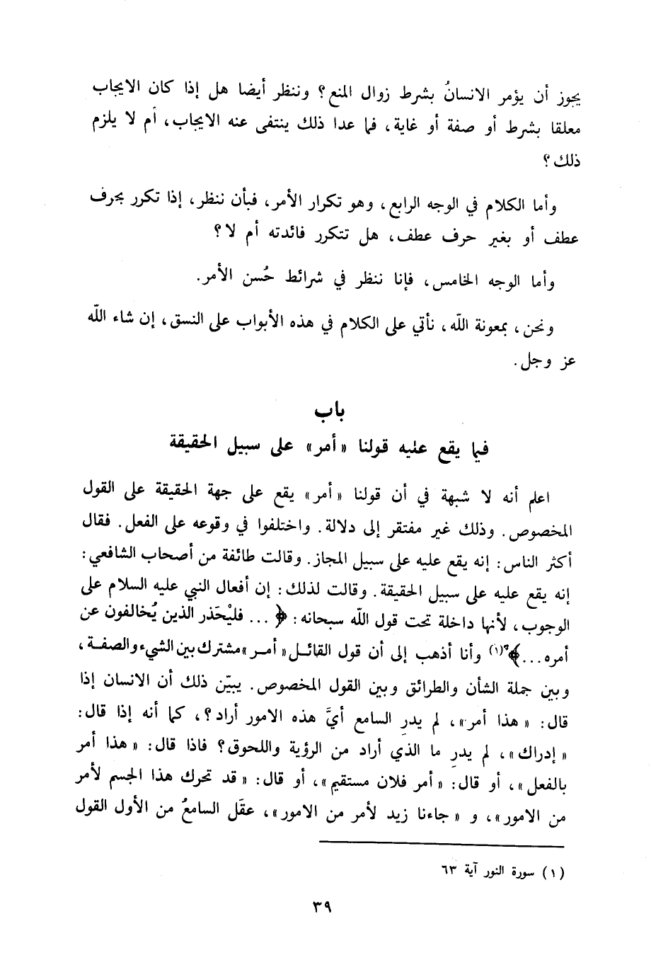 اعْلَم أَنه لَا شُبْهَة فِي أَن قَوْلنَا أَمر يَقع على جِهَة الْحَقِيقَة على القَوْل الْمَخْصُوص وَذَلِكَ غير مفتقر إِلَى دلَالَة وَاخْتلفُوا فِي وُقُوعه على الْفِعْل فَقَالَ أَكثر النَّاس إِنَّه يَقع عَلَيْهِ على سَبِيل الْمجَاز وَقَالَت طَائِفَة من أَصْحَاب الشَّافِعِي إِنَّه يَقع عَلَيْهِ على سَبِيل الْحَقِيقَة وَقَالَت لذَلِك إِن أَفعَال النَّبِي عَلَيْهِ السَّلَام على الْوُجُوب لِأَنَّهَا دَاخِلَة تَحت قَول الله سُبْحَانَهُ {فليحذر الَّذين يخالفون عَن أمره} وَأَنا أذهب إِلَى أَن قَول الْقَائِل أَمر مُشْتَرك بَين الشَّيْء وَالصّفة وَبَين جملَة الشَّأْن والطرائق وَبَين القَوْل الْمَخْصُوص يبين ذَلِك أَن الانسان إِذا قَالَ هَذَا أَمر لم يدر السَّامع أَي هَذِه الْأُمُور أَرَادَ كَمَا أَنه إِذا قَالَ إِدْرَاك لم يدر مَا الَّذِي أَرَادَ من الرُّؤْيَة واللحوق فاذا قَالَ هَذَا أَمر بِالْفِعْلِ أَو قَالَ أَمر فلَان مُسْتَقِيم أَو قَالَ قد تحرّك هَذَا الْجِسْم لأمر من الْأُمُور وجاءنا زيد لأمر من الامور عقل السَّامع من الأول القَوْل