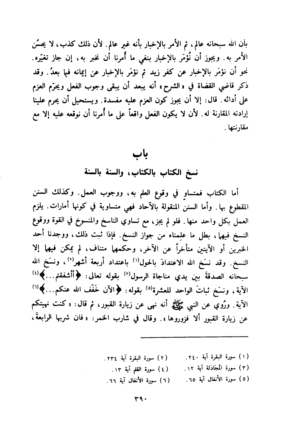أما الْكتاب فمتساو فِي وُقُوع الْعلم بِهِ وَوُجُوب الْعَمَل وَكَذَلِكَ السّنَن الْمَقْطُوع بهَا واما السّنَن المنقولة بالآحاد فَهِيَ مُتَسَاوِيَة فِي كَونهَا أَمَارَات يلْزم الْعَمَل بِكُل وَاحِد مِنْهَا فَلَو لم يجز مَعَ تَسَاوِي النَّاسِخ والمنسوخ فِي الْقُوَّة وَوُقُوع النّسخ فيهمَا بَطل مَا علمناه من جَوَاز النّسخ فَإِذا ثَبت ذَلِك وَوجدنَا أحد الْخَبَرَيْنِ أَو الْآيَتَيْنِ مُتَأَخِّرًا عَن الآخر وحكمهما متناف لم يُمكن فيهمَا إِلَّا النّسخ وَقد نسخ الله الِاعْتِدَاد بالحول باعتداد أَرْبَعَة أشهر وَنسخ الله سُبْحَانَهُ الصَّدَقَة بَين يَدي مُنَاجَاة الرَّسُول بقوله تَعَالَى {أَأَشْفَقْتُم} الْآيَة وَنسخ ثبات الْوَاحِد للعشرة بقوله {الْآن خفف الله عَنْكُم} الْآيَة وَرُوِيَ عَن النَّبِي صلى الله عَلَيْهِ وَسلم أَنه نهى عَن زِيَارَة الْقُبُور ثمَّ قَالَ كنت نَهَيْتُكُمْ عَن زِيَارَة الْقُبُور أَلا فزوروها وَقَالَ فِي شَارِب الْخمر فان شربهَا الرَّابِعَة