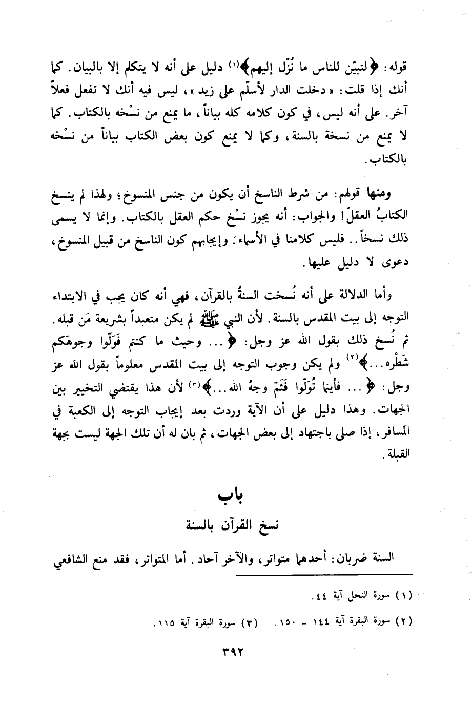 وَأما الدّلَالَة على أَنه نسخت السّنة بِالْقُرْآنِ فَهِيَ أَنه كَانَ يجب فِي الِابْتِدَاء التَّوَجُّه إِلَى بَيت الْمُقَدّس بِالسنةِ لِأَن النَّبِي صلى الله عَلَيْهِ وَسلم لم يكن متعبدا بشريعة من قبله ثمَّ نسخ ذَلِك بقول الله عز وَجل {وَحَيْثُ مَا كُنْتُم فَوَلوا وُجُوهكُم شطره} وَلم يكن وجوب التَّوَجُّه إِلَى بَيت الْمُقَدّس مَعْلُوما بقول الله عز وَجل {فأينما توَلّوا فثم وَجه الله} لِأَن هَذَا يَقْتَضِي التَّخْيِير بَين الْجِهَات وَهَذَا دَلِيل على أَن الْآيَة وَردت بعد إِيجَاب التَّوَجُّه إِلَى الْكَعْبَة فِي الْمُسَافِر إِذا صلى بِاجْتِهَاد إِلَى بعض الْجِهَات ثمَّ بَان لَهُ أَن تِلْكَ الْجِهَة لَيست بِجِهَة الْقبْلَة - صَلَّى اللَّهُ عَلَيْهِ وَسَلَّم َ - بَاب نسخ الْقُرْآن بِالسنةِ - صَلَّى اللَّهُ عَلَيْهِ وَسَلَّم َ -