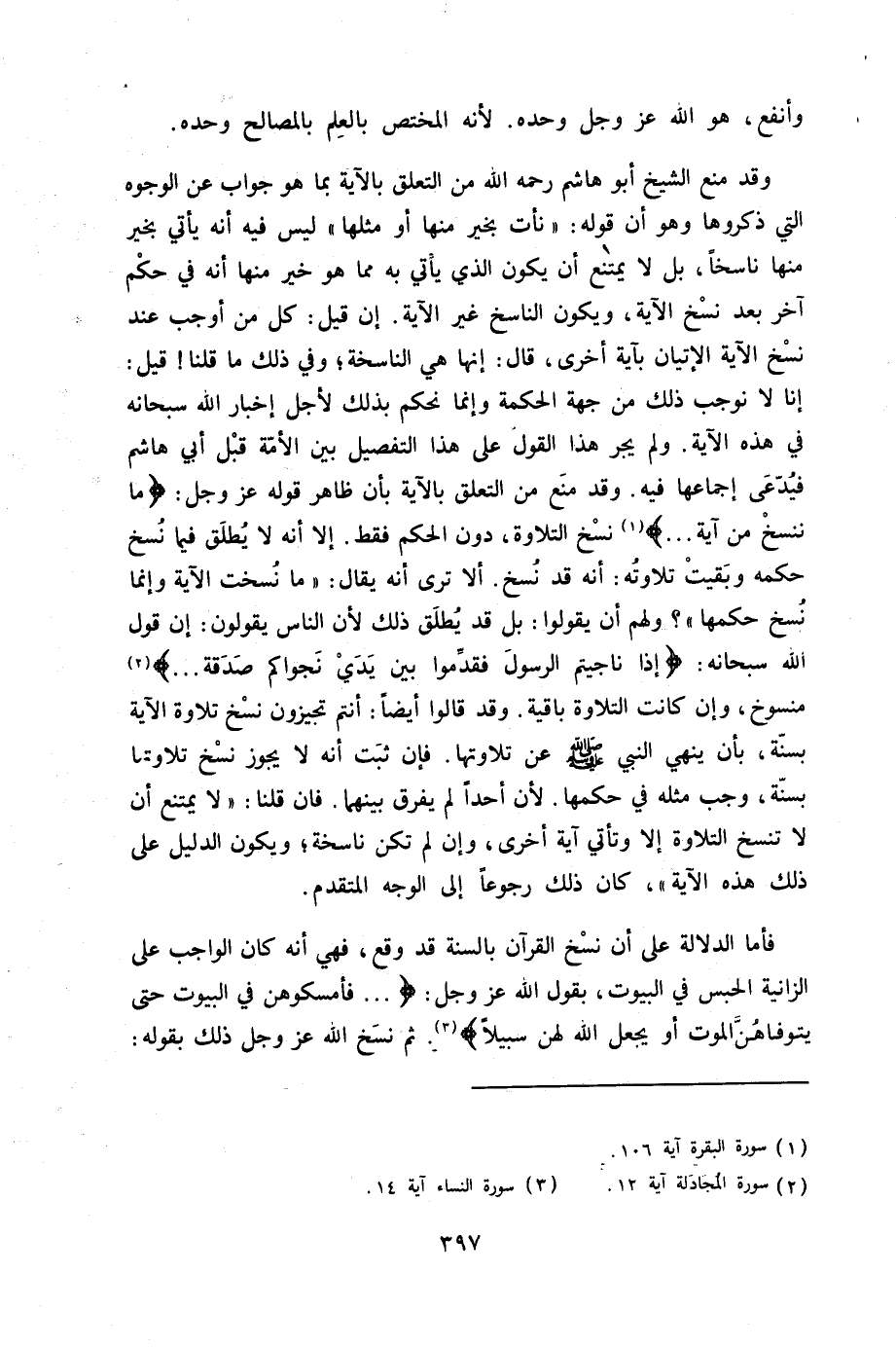 وَقد منع الشَّيْخ أَبُو هَاشم رَحمَه الله من التَّعَلُّق بالاية بِمَا هُوَ جَوَاب عَن الْوُجُوه الَّتِي ذكروها وَهُوَ أَن قَوْله نأت بِخَير مِنْهَا أَو مثلهَا لَيْسَ فِيهِ أَنه يَأْتِي بِخَير مِنْهَا نَاسِخا بل لَا يمْتَنع أَن يكون الَّذِي يَأْتِي بِهِ مِمَّا هُوَ خير مِنْهَا أَنه فِي حكم آخر بعد نسخ الْآيَة وَيكون النَّاسِخ غير الْآيَة إِن قيل كل من أوجب عِنْد نسخ الْآيَة الْإِتْيَان بِآيَة أُخْرَى قَالَ إِنَّهَا هِيَ الناسخة وَفِي ذَلِك مَا قُلْنَا قيل إِنَّا لَا نوجب ذَلِك من جِهَة الْحِكْمَة وَإِنَّمَا نحكم بذلك لأجل إِخْبَار الله سُبْحَانَهُ فِي هَذِه الْآيَة وَلم يجر هَذَا القَوْل على هَذَا التَّفْصِيل بَين الْأمة قبل أبي هَاشم فيدعى إجماعها فِيهِ وَقد منع من التَّعَلُّق بِالْآيَةِ بِأَن ظَاهر قَوْله عز وَجل {مَا ننسخ من آيَة} نسخ التِّلَاوَة دون الحكم فَقَط إِلَّا أَنه لَا يُطلق فِيمَا نسخ حكمه وَبقيت تِلَاوَته أَنه قد نسخ أَلا ترى أَنه يُقَال مَا نسخت الْآيَة وَإِنَّمَا نسخ حكمهَا وَلَهُم أَن يَقُولُوا بل قد يُطلق ذَلِك لِأَن النَّاس يَقُولُونَ إِن قَول الله سُبْحَانَهُ {إِذا نَاجَيْتُم الرَّسُول فقدموا بَين يَدي نَجوَاكُمْ صَدَقَة} مَنْسُوخ وَإِن كَانَت التِّلَاوَة بَاقِيَة وَقد قَالُوا أَيْضا أَنْتُم تجيزون نسخ تِلَاوَة الْآيَة بِسنة بِأَن يُنْهِي النَّبِي صلى الله عَلَيْهِ وَسلم عَن تلاوتها فَإِن ثَبت أَنه لَا يجوز نسخ تلاوتها بِسنة وَجب مثله فِي حكمهَا لِأَن أحدا لم يفرق بَينهمَا فان قُلْنَا لَا يمْتَنع أَن لَا تنسخ التِّلَاوَة إِلَّا وَتَأْتِي آيَة أُخْرَى وَإِن لم تكن ناسخة وَيكون الدَّلِيل على ذَلِك هَذِه الْآيَة كَانَ ذَلِك رُجُوعا إِلَى الْوَجْه الْمُتَقَدّم