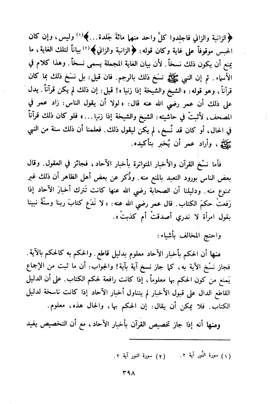 وَلَيْسَ وَإِن كَانَ الْحَبْس مَوْقُوفا على غَايَة وَكَانَ قَوْله {الزَّانِيَة وَالزَّانِي} بَيَانا لتِلْك الْغَايَة مَا يمْنَع أَن يكون ذَلِك نسخا لِأَن بَيَان الْغَايَة المجملة يُسمى نسخا وَهَذَا كَلَام فِي الْأَسْمَاء ثمَّ إِن النَّبِي صلى الله عَلَيْهِ وَسلم نسخ ذَلِك بِالرَّجمِ فان قيل بل نسخ ذَلِك بِمَا كَانَ قُرْآنًا وَهُوَ قَوْله الشَّيْخ وَالشَّيْخَة إِذا زَنَيَا قيل إِن ذَلِك لم يكن قُرْآنًا يدل على ذَلِك أَن عمر رَضِي الله عَنهُ قَالَ لَوْلَا أَن يَقُول النَّاس زَاد عمر فِي الْمُصحف لأثبت فِي حَاشِيَته الشَّيْخ وَالشَّيْخَة إِذا زَنَيَا فَلَو كَانَ ذَلِك قُرْآنًا فِي الْحَال أَو كَانَ قد نسخ لم يكن ليقول ذَلِك فَعلمنَا أَن ذَلِك سنة من النَّبِي صلى الله عَلَيْهِ وَسلم وَأَرَادَ عمر أَن يخبر بتأكيده